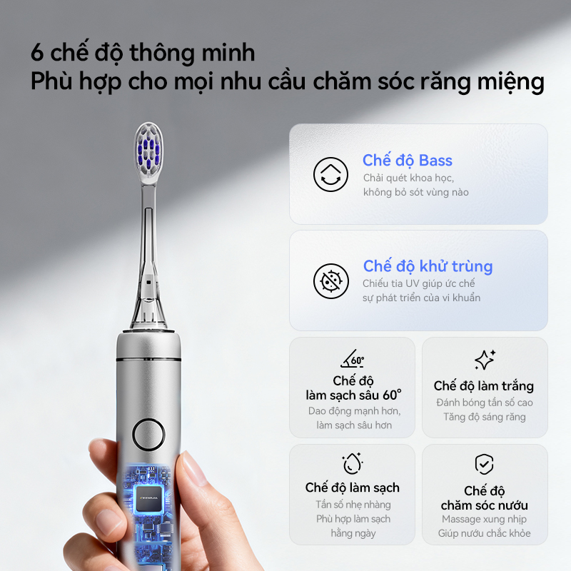 6 Chế độ: - Chế độ chải Bass (chải theo khuyến nghị khoa học) - Chế độ làm trắng (rung tần số cao) - Chế độ hằng ngày (rung tần số trung bình) - Chế độ chăm sóc nướu (rung tần số thấp) - Chế độ khử khuẩn bằng tia UV - Chế độ làm sạch sâu (đầu chải dao động tới 60°) |
