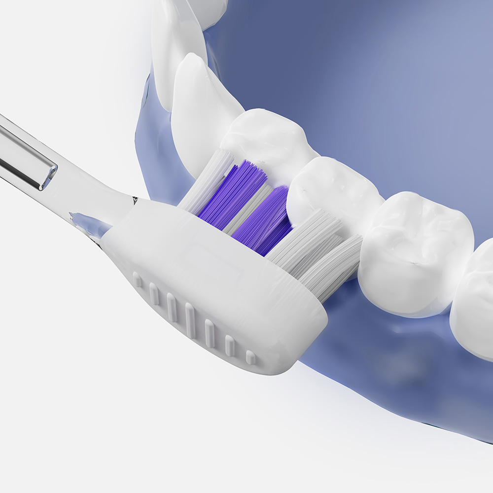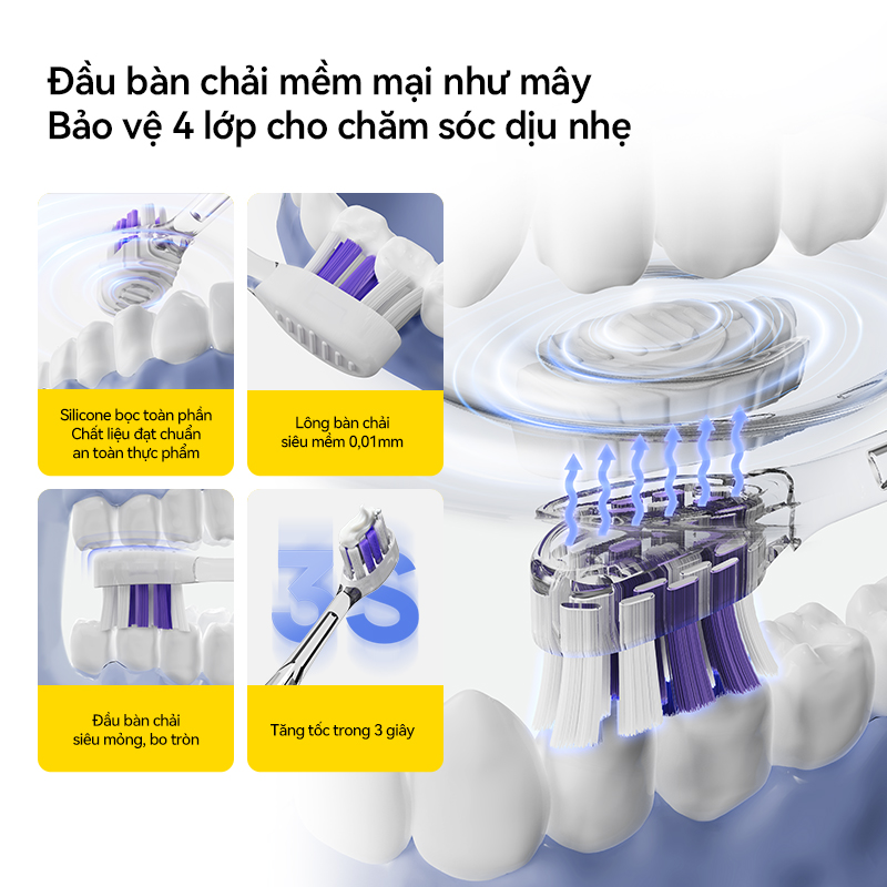 Cấu tạo đầu chải của Deerma YS01 sở hữu 4 lớp bảo vệ chuyên sâu nhằm mang đến trải nghiệm vệ sinh răng miệng toàn diện. Lớp silicone đàn hồi bên ngoài đóng vai trò giảm thiểu va chạm trực tiếp, trong khi các sợi lông siêu mảnh 0.01mm dễ dàng len lỏi vào từng kẽ nhỏ. Phần đầu chải có kiểu dáng mỏng và bo tròn, tạo điều kiện cho việc tiếp cận những vị trí khuất sâu bên trong khoang miệng. Thêm vào đó, cơ chế ổn định lực trong vòng 3 giây duy trì sự êm ái xuyên suốt, tránh gây áp lực quá mức và bảo vệ mô nướu một cách tối ưu.
