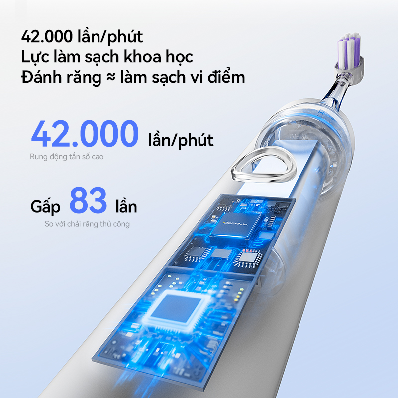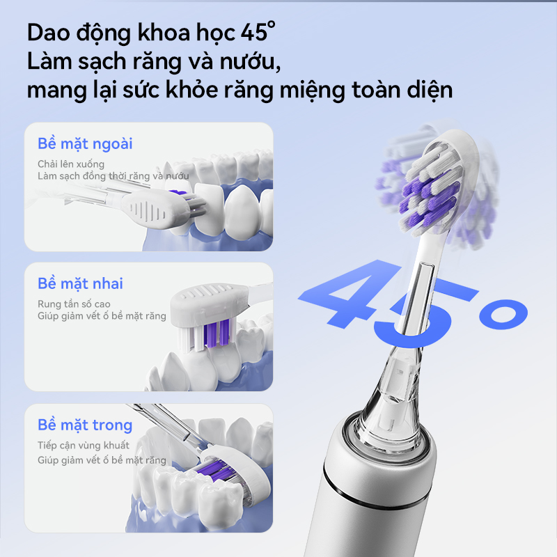 - Cơ chế dao động 45°, giúp chải răng chuẩn khoa học