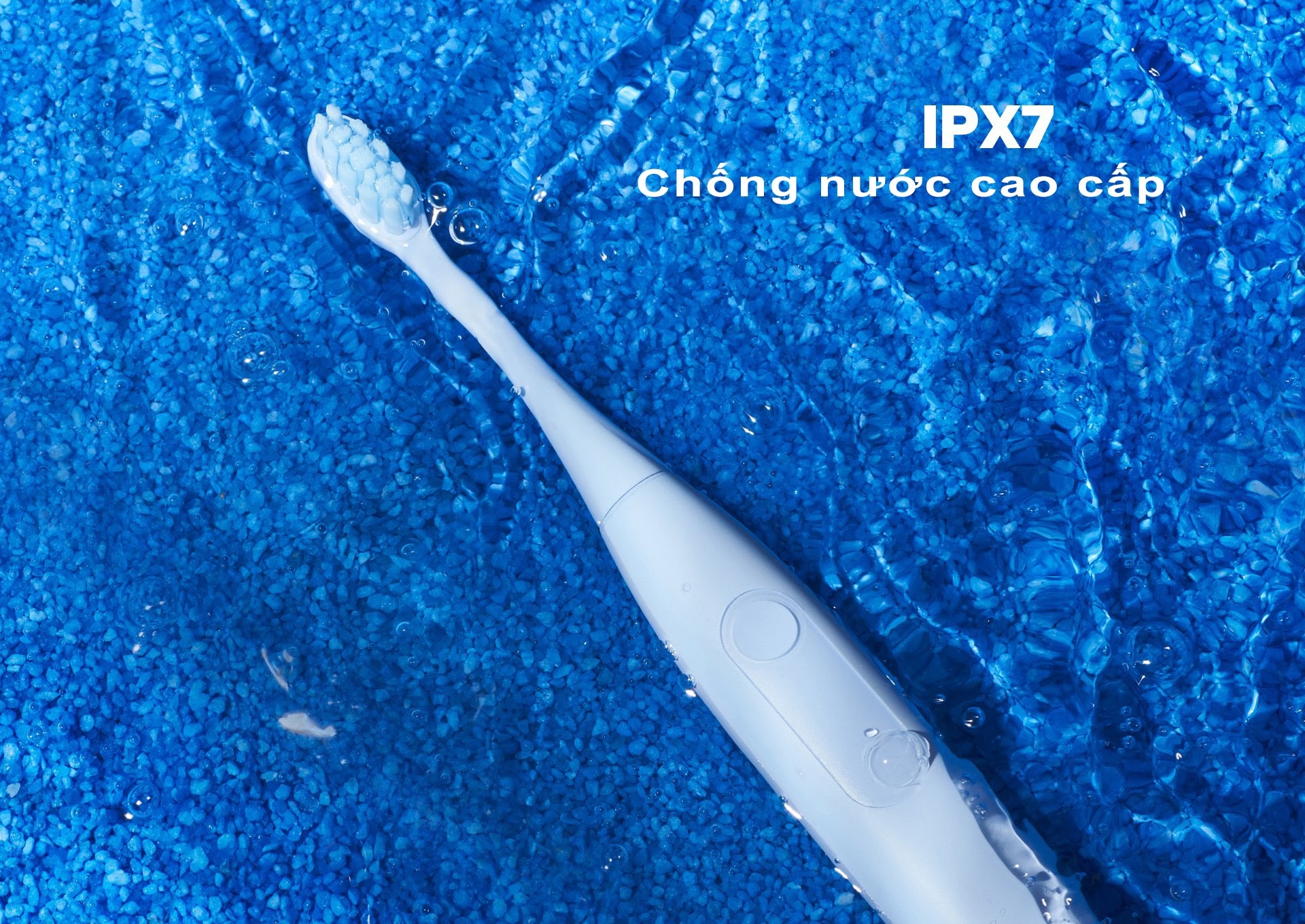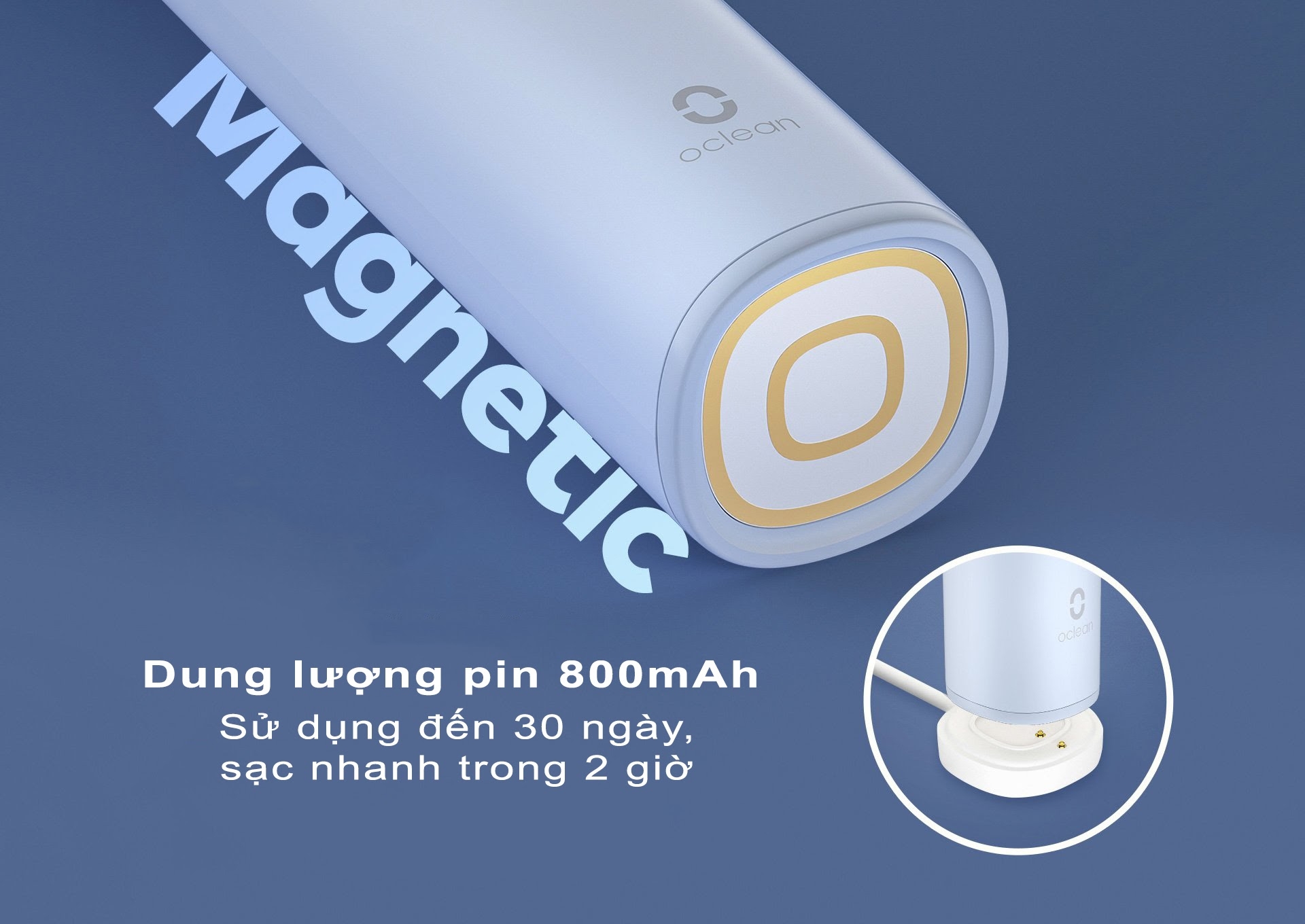 Bàn chải được trang bị viên pin dung lượng 800mAh, cung cấp thời gian sử dụng lên đến 30 ngày chỉ với một lần sạc. Bên cạnh đó, tính năng hỗ trợ sạc nhanh còn giúp bàn chải sạc đầy pin nhanh chóng trong 2 giờ. Ngoài ra, thân máy với thiết kế chống thấm nước chuẩn IPX7 giúp người dùng an tâm khi sử dụng bàn chải trong môi trường nước.