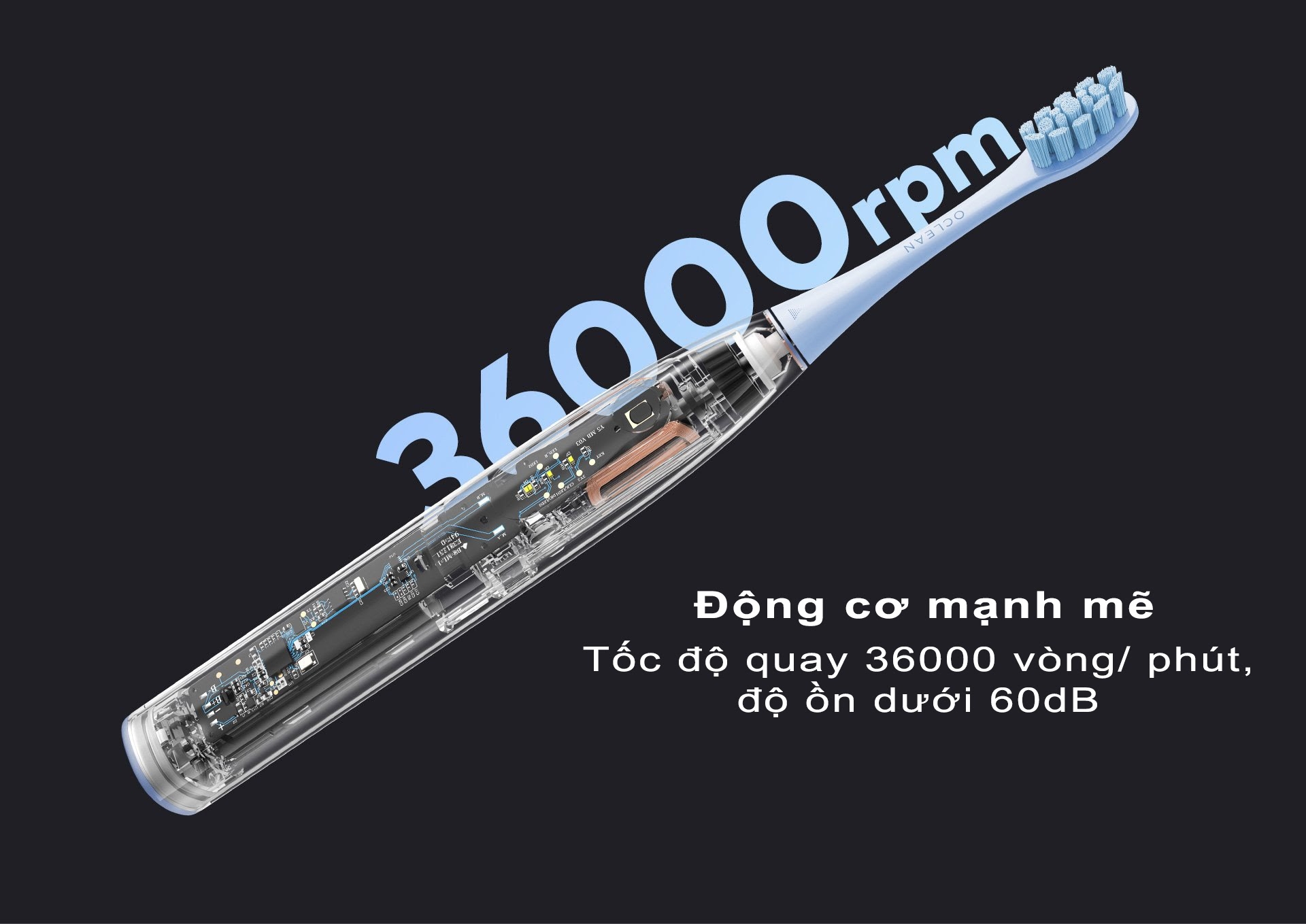 Bàn chải Oclean F1 được trang bị động cơ không chổi than hiệu suất cao, mang lại hiệu quả làm sạch tối ưu. Động cơ sở hữu tuổi thọ lên đến 5000 giờ, gấp 10 lần tuổi thọ của động cơ truyền thống. Mặc dù hoạt động với công suất lớn, thế nhưng độ ồn của toàn bộ máy phát ra cực kỳ thấp, chỉ dưới 60dB. Ngoài ra, sản phẩm cũng được cải tiến với tốc độ chải lên đến 36000 lần/ phút, giúp tăng cường khả năng làm sạch, đánh bay vết ố vàng và loại bỏ các mảng bám, cho trải nghiệm đánh răng thoải mái hơn so với những dòng bàn chải thông thường.