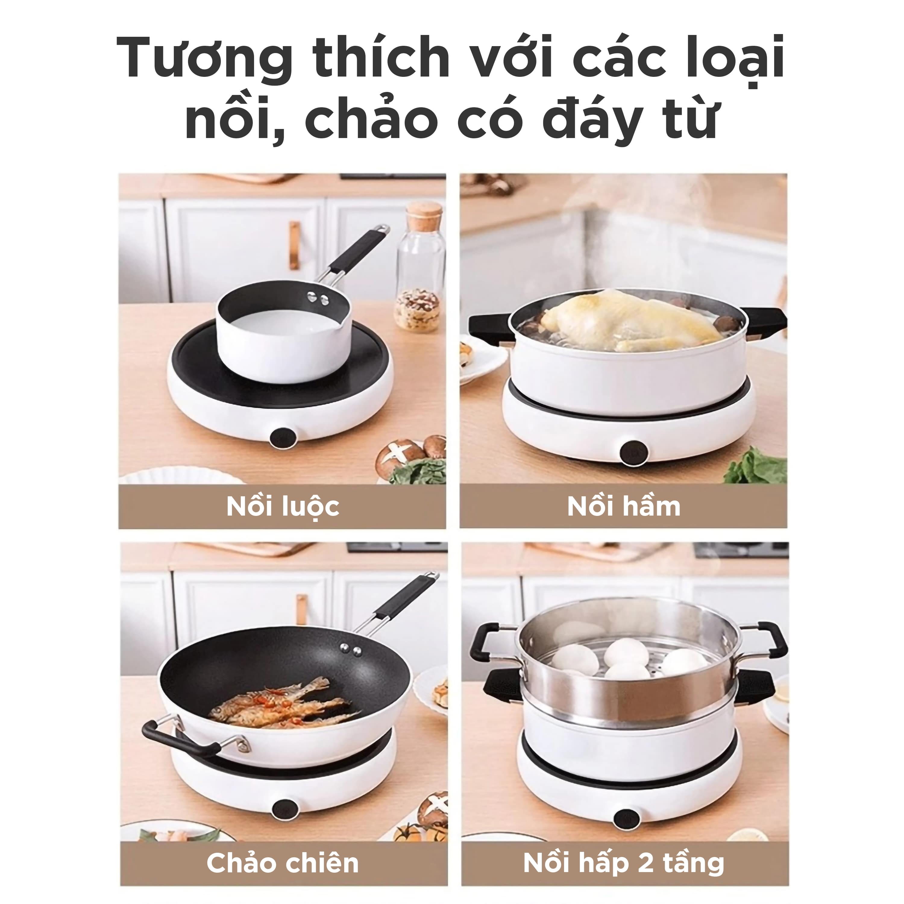 Lifeite LFT-010 sử dụng công nghệ gia nhiệt bằng điện từ, mang lại khả năng tương thích đa năng với nhiều loại nồi, chảo làm từ các chất liệu khác nhau như gang, inox nhiễm từ hay các ấm đun nước có đáy từ, giúp tận dụng tối đa hiệu quả nấu nướng mà không cần lo lắng về chất liệu nồi. Đây là điểm cộng lớn cho sự linh hoạt và tiện ích của bếp điện từ Lifeite, đáp ứng nhu cầu sử dụng đa dạng trong mỗi gian bếp.