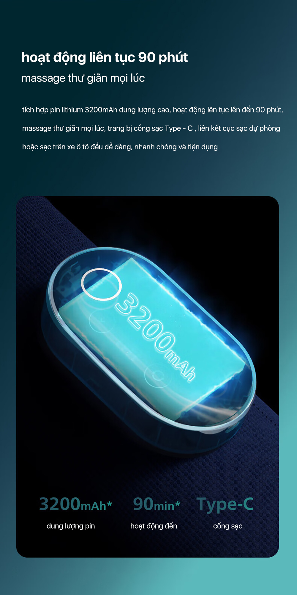 Đai massage lưng Philips PPM4721 được tích hợp viên pin dung lượng cao 3200mAh nhằm mang đến sự linh hoạt hơn cho quá trình sử dụng của người dùng, không cần cắm điện trực tiếp để bạn có thể sử dụng máy ở bất cứ đâu. Cụ thể, viên pin có thể đáp ứng thời gian massage lên đến 120 phút mà bạn không cần phải sạc pin thường xuyên.