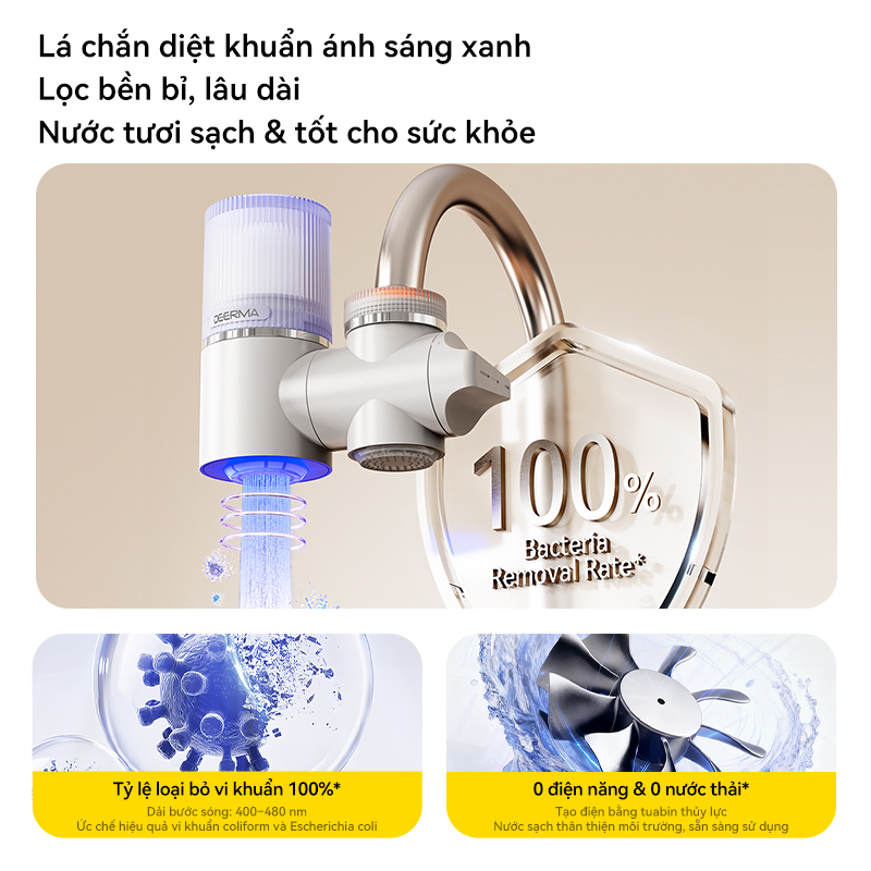 Điểm vượt trội của đầu vòi lọc nước Deerma LT02 nằm ở khả năng lọc nước bằng ánh sáng xanh hoàn toàn tự động mà không cần kết nối dây nguồn hay phát sinh nước thải dư thừa. Nhờ tích hợp cơ chế tuabin thủy điện bên trong, thiết bị tự tạo ra năng lượng từ chính dòng nước chảy để vận hành hệ thống, đảm bảo quá trình làm sạch diễn ra ổn định và thân thiện với môi trường.