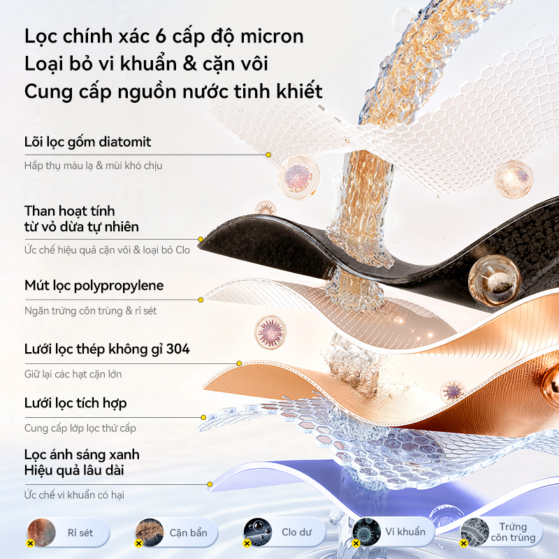 Deerma LT02 tích hợp hệ thống lọc 6 tầng hiện đại, có khả năng loại bỏ triệt để vi khuẩn, clo tồn dư cùng mùi hôi khó chịu. Cơ chế này không chỉ mang lại nguồn nước đầu ra sạch trong mà còn bảo toàn trọn vẹn các khoáng chất thiết yếu. Điểm nhấn ấn tượng nằm ở tầng lọc cuối cùng ứng dụng công nghệ ánh sáng xanh, tối ưu hóa khả năng diệt khuẩn nhằm nâng cấp chất lượng nước an toàn hơn cho sức khỏe người dùng.