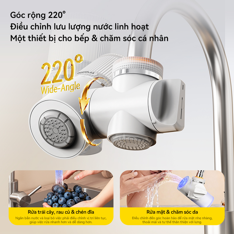 Với khả năng điều chỉnh góc xoay lên đến 220°, Deerma LT02 cho phép thay đổi hướng dòng chảy một cách dễ dàng để phục vụ mọi nhu cầu sinh hoạt. Cấu tạo này mang tới sự thuận tiện tối đa khi cần làm sạch ở các vị trí khác nhau trong bồn rửa hoặc hỗ trợ thao tác vệ sinh cá nhân, rửa mặt thêm nhanh chóng và hiệu quả.