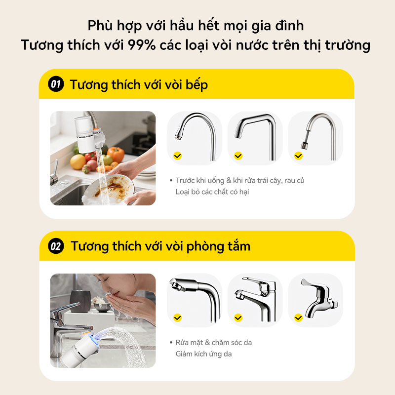 Đi kèm với 8 đầu nối sở hữu kích thước đa dạng, đầu vòi lọc nước Deerma LT02 tương thích hoàn hảo với mọi hệ thống vòi thông dụng. Việc lắp đặt trở nên đơn giản hơn bao giờ hết khi thiết bị có thể kết nối chắc chắn trên cả vòi có ren lẫn không ren, mang lại sự ổn định lâu dài trong suốt quá trình sử dụng tại nhiều khu vực khác nhau.