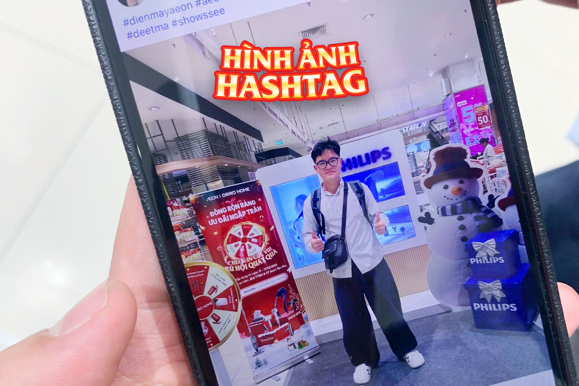 Cầm bảng hashtag tại khu vực sự kiện, chụp ảnh hoặc quay video check-in tại gian hàng.