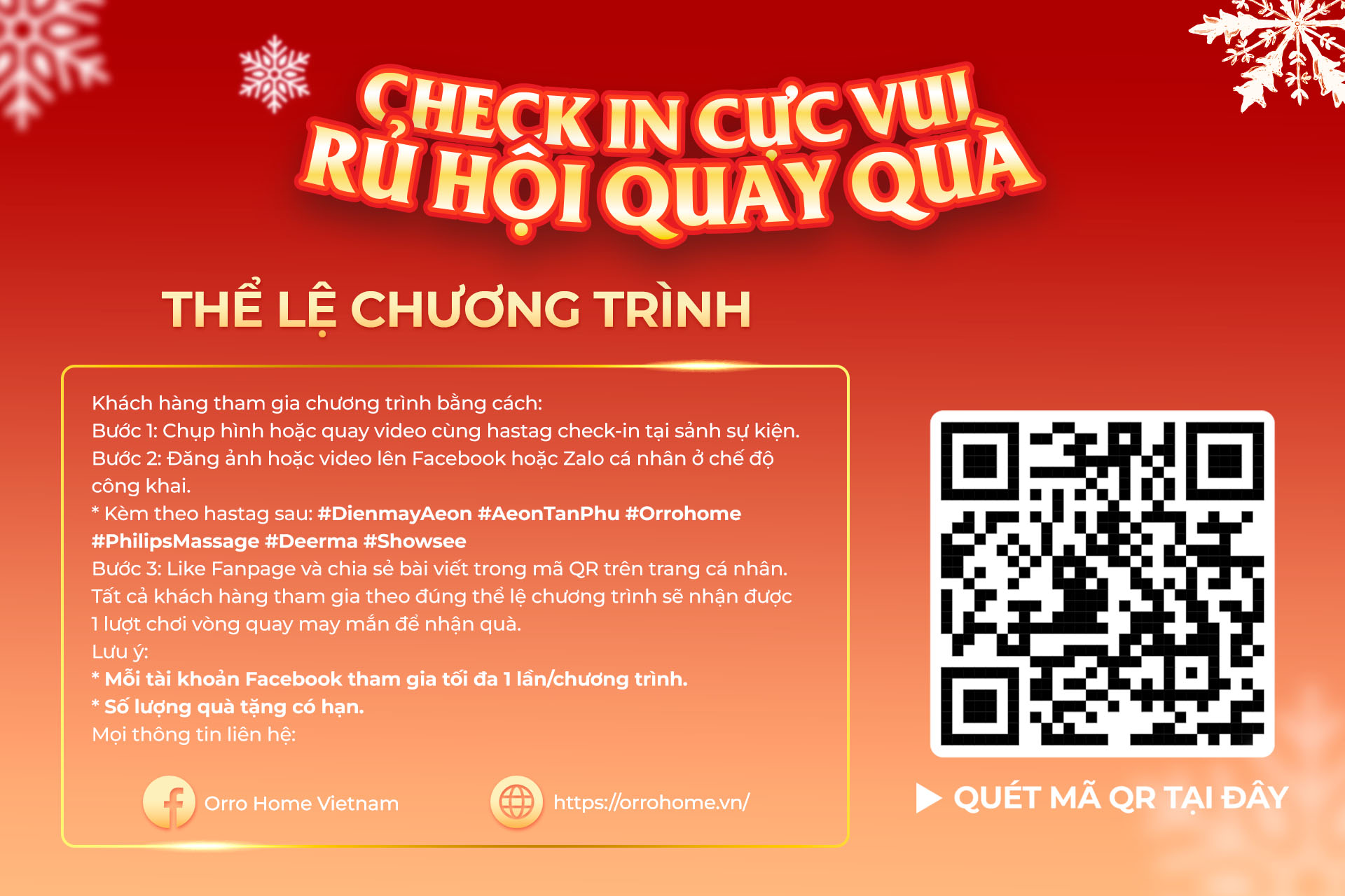 Khách tham quan chỉ cần thực hiện một số bước đơn giản như chụp ảnh, đăng tải bài viết và theo dõi Fanpage Orro Home là đã có thể nhận quà tại chỗ. Không cần mua hàng, không yêu cầu hóa đơn - mỗi lượt check-in hợp lệ đều được nhận quà tặng chính hãng từ Orro Home, đảm bảo ai đến tham gia cũng vui mang quà về. Khu vực sự kiện được thiết kế bắt mắt với backdrops, bảng hashtag và không gian bày trí ấn tượng, phù hợp cho việc chụp ảnh check-in. Đội ngũ nhân viên luôn túc trực để hỗ trợ khách chụp hình, giới thiệu sản phẩm và hướng dẫn thể lệ, mang đến trải nghiệm vui vẻ và thân thiện cho mọi độ tuổi.
