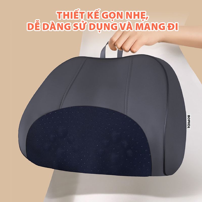 Với thiết kế gọn gàng, trọng lượng chỉ 1,25 kg, gối massage hồng ngoại Bomidi MP1 dễ cầm nắm và linh hoạt mang theo khi cần sử dụng ở nhiều nơi khác nhau. Phần tay cầm hai bên chắc chắn hỗ trợ di chuyển thuận tiện, trong khi dây đeo phía sau cho phép cố định gối lên tựa ghế tại văn phòng, trên xe ô tô hoặc ghế ngồi tại nhà. Thiết kế này giúp gối luôn giữ đúng vị trí khi massage, không bị xô lệch hay trượt ra ngoài trong quá trình sử dụng. Cấu tạo đơn giản, không cần lắp đặt phức tạp, phù hợp cho những ai thường xuyên di chuyển hoặc muốn duy trì thói quen thư giãn ở nhiều không gian khác nhau trong ngày.