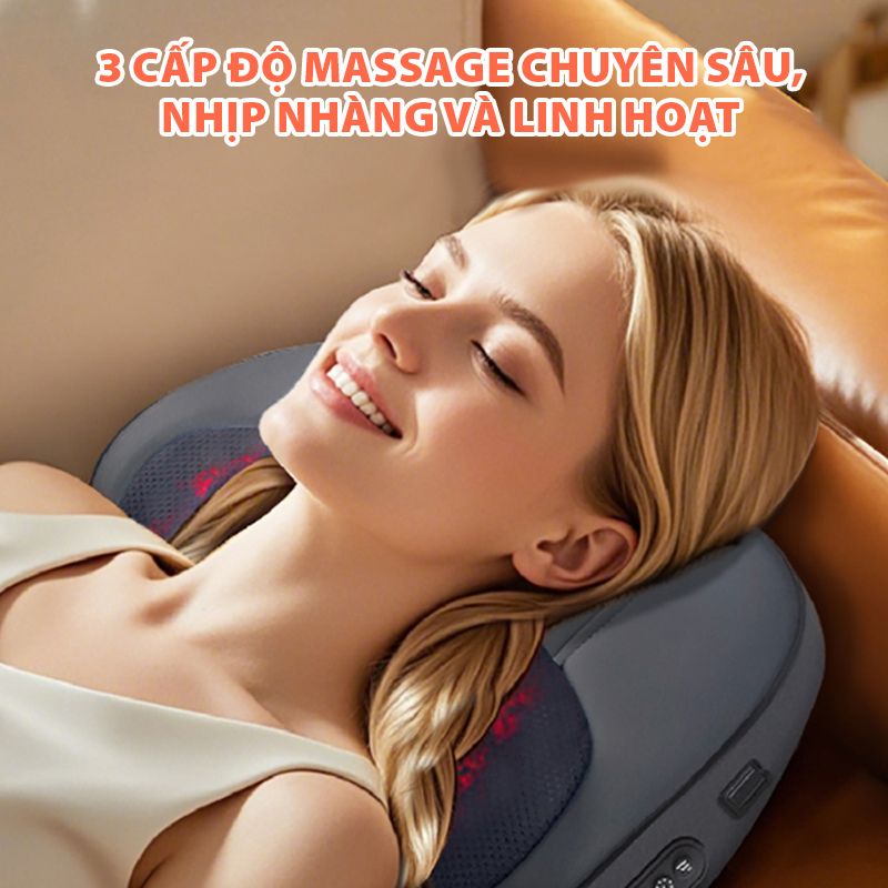 Sở hữu ba cấp độ massage từ nhẹ đến mạnh, gối massage Bomidi MP1 Pro giúp người dùng dễ dàng điều chỉnh cường độ phù hợp theo từng nhu cầu sử dụng. Cơ chế vận hành kết hợp cùng 20 viên bi lăn massage có tốc độ quay lên tới 2800 vòng/phút, tạo lực day – ấn – xoay liên tục, mô phỏng thao tác của bàn tay thật. Các chuyển động được thiết kế để duy trì nhịp độ ổn định, không rung giật đột ngột, nhờ đó mang lại cảm giác dễ chịu và êm ái ngay cả ở mức cường độ cao. Với mỗi cấp độ, gối đều tác động sâu vào các vùng cơ bị căng mỏi, giúp làm dịu nhanh cảm giác đau nhức, hỗ trợ thư giãn rõ rệt chỉ sau một chu kỳ sử dụng ngắn.