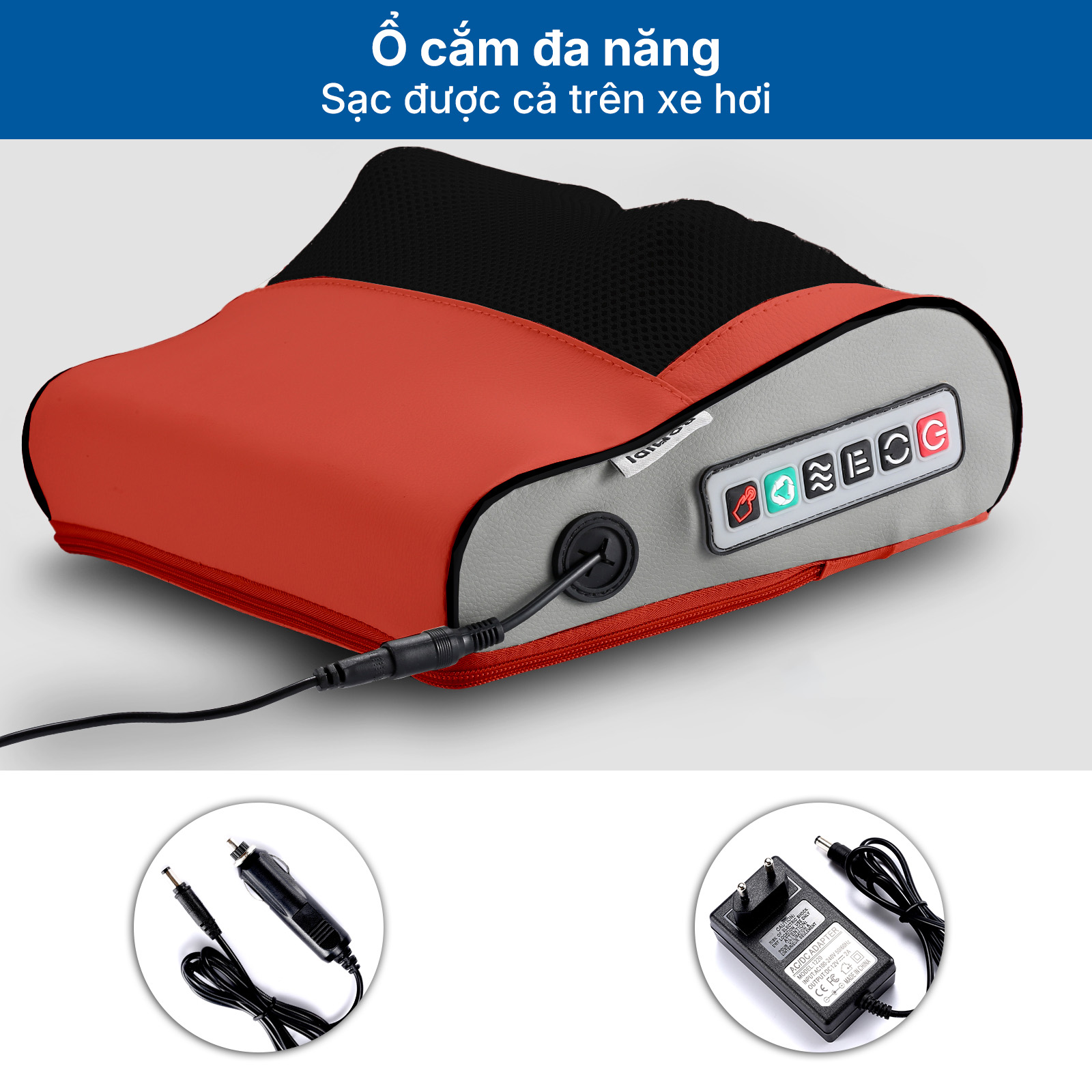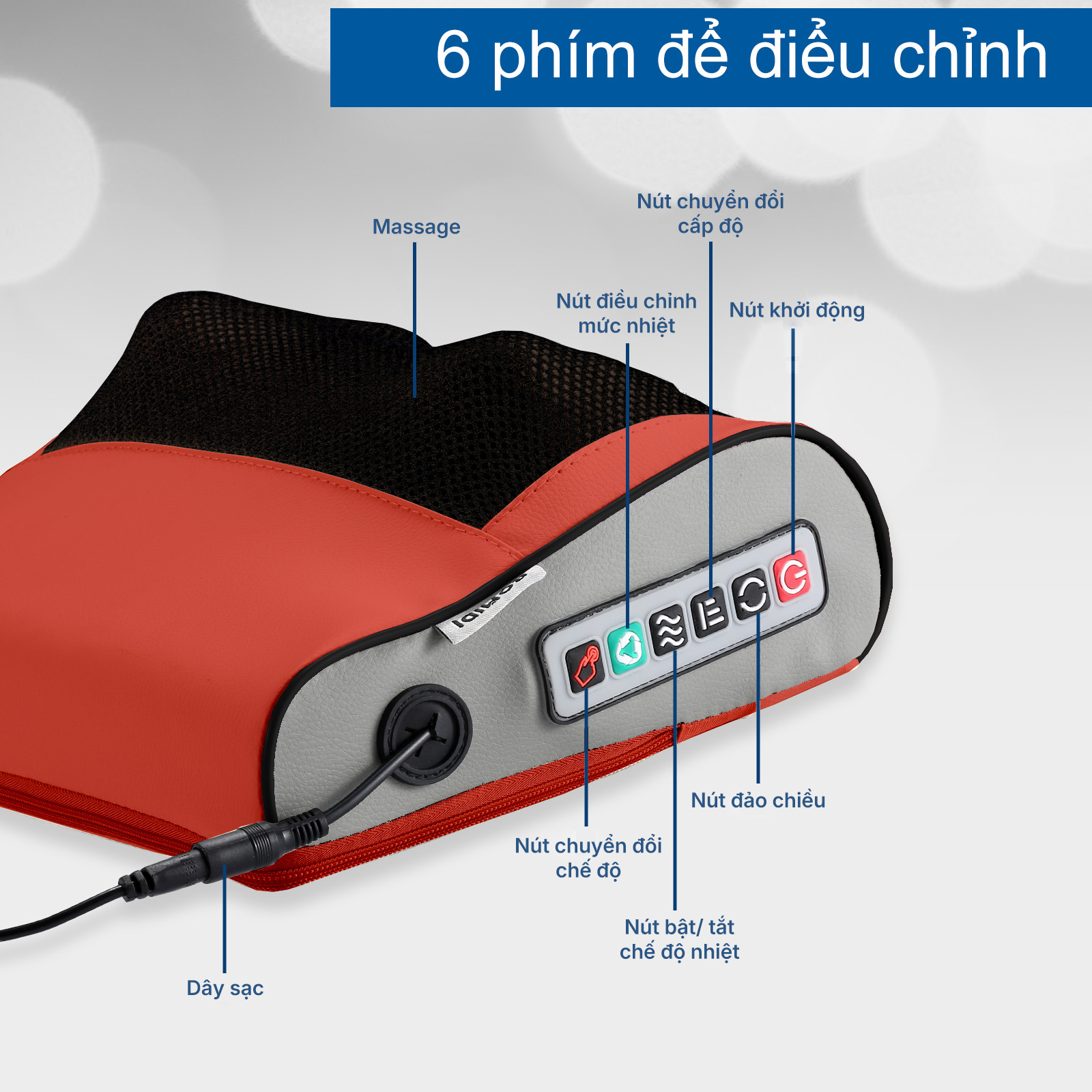 | Tính năng | 3 Chế độ 3 cấp độ Bật/Tắt chườm ấm hồng ngoại Đảo chiều massage Cơ chế tiết kiệm năng lượng |