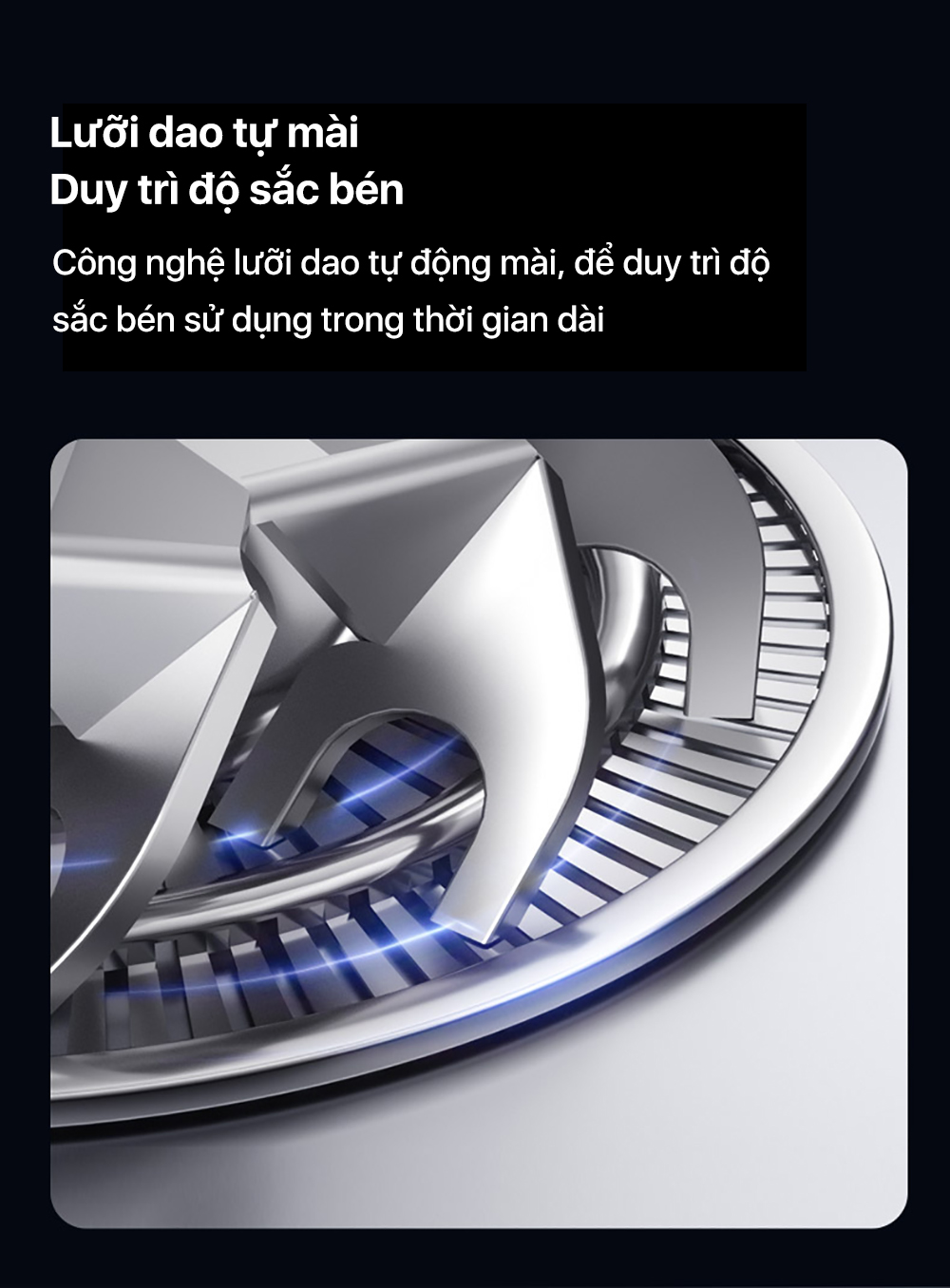 - Cơ chế tự động mài lưỡi dao, khóa an toàn khi cất giữ