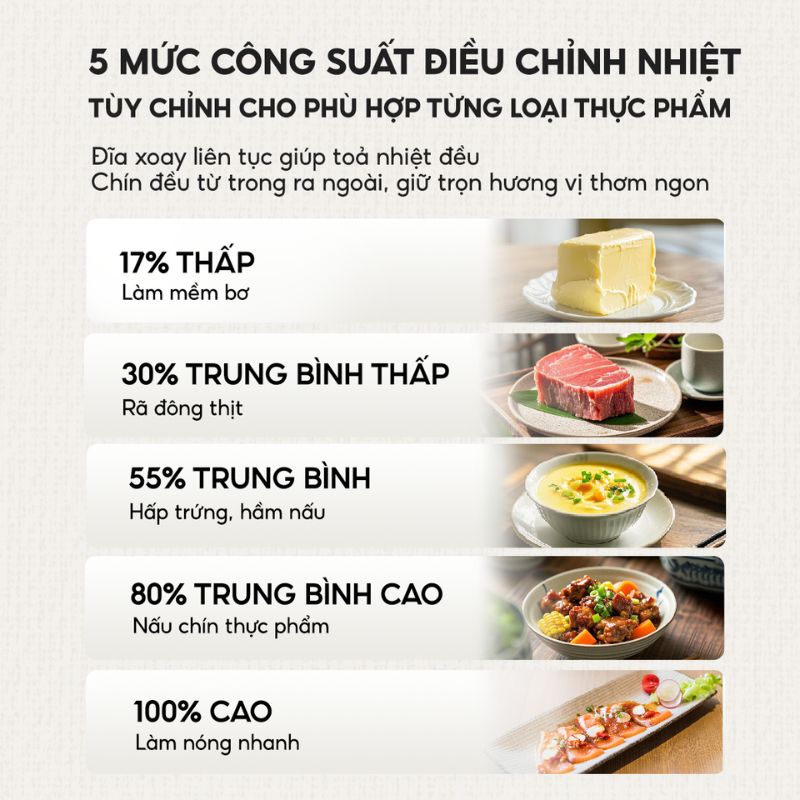Hỗ trợ linh hoạt trong quá trình hâm nóng và chế biến, AQUA AQS-MWM2001R(W)-VN được trang bị 5 mức công suất điều chỉnh phù hợp với từng loại thực phẩm. Nhờ khả năng kiểm soát nhiệt độ chính xác, người dùng dễ dàng chọn mức công suất từ khoảng 17% đến 100%, bao gồm cả chế độ rã đông hiệu quả. Kết hợp cùng đĩa xoay liên tục, nhiệt lượng được phân bổ đều giúp món ăn chín kỹ, giữ trọn độ ngon và dinh dưỡng. Tính năng này mang đến trải nghiệm nấu nướng tiện lợi, chủ động và tối ưu hơn mỗi ngày.