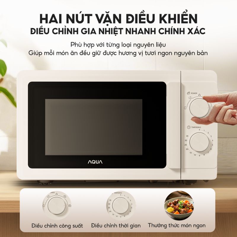 Thiết kế hai nút vặn cơ học giúp lò vi sóng AQUA AQS-MWM2001R(W)-VN dễ dàng điều chỉnh theo nhu cầu sử dụng hằng ngày. Nút đầu tiên cho phép lựa chọn mức công suất nhiệt phù hợp, hỗ trợ chế biến đa dạng món ăn. Nút thứ hai dùng để hẹn giờ linh hoạt lên đến 35 phút, đảm bảo kiểm soát thời gian chính xác cho từng loại nguyên liệu. Cơ chế vận hành đơn giản, không cầu kỳ, đặc biệt thân thiện với người lớn tuổi hoặc người dùng ít tiếp xúc với thiết bị điện tử. Sự kết hợp này mang lại trải nghiệm sử dụng tiện lợi và hiệu quả.