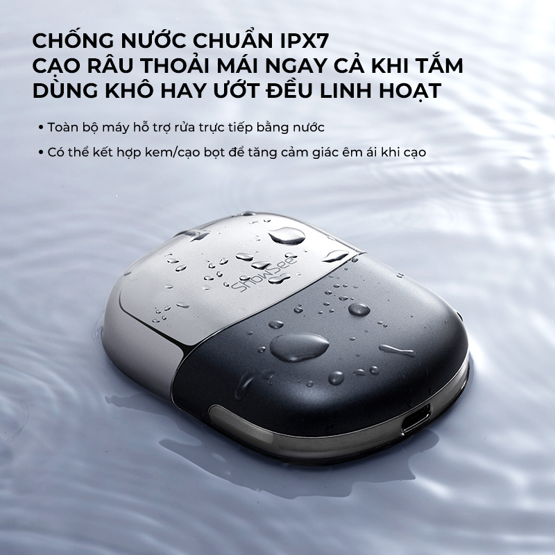 Đạt chuẩn chống nước IPX7, SHOWSEE KM10 cho phép sử dụng linh hoạt cả khi cạo khô lẫn cạo ướt. Người dùng có thể thoải mái kết hợp cùng bọt cạo hoặc gel mà không lo ảnh hưởng đến động cơ bên trong. Sau khi sử dụng, toàn bộ thân máy có thể rửa trực tiếp dưới vòi nước để vệ sinh nhanh chóng, giữ bề mặt dao cạo luôn sạch sẽ và an toàn cho lần dùng tiếp theo. Đặc biệt, phần đầu cạo được thiết kế dạng nam châm giúp tháo lắp dễ dàng, thuận tiện cho việc làm sạch hoặc thay thế khi cần. Tính năng chống nước toàn diện này vừa gia tăng tuổi thọ thiết bị, vừa mang lại sự yên tâm trong quá trình sử dụng hằng ngày.
