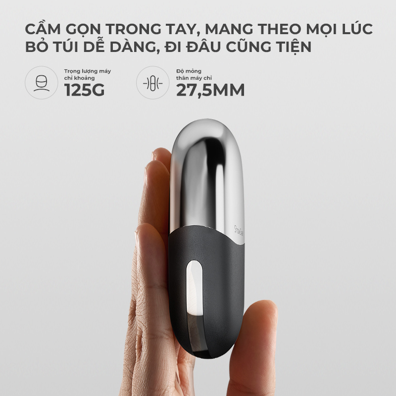 Trọng lượng chỉ 125g và độ mỏng 2,75 cm, SHOWSEE KM10 phù hợp để bỏ túi áo hoặc balo, thuận tiện mang theo khi di chuyển. Thiết kế nhỏ gọn nhưng tinh tế, các chi tiết được hoàn thiện tỉ mỉ mang đến tổng thể sang trọng và hiện đại. Sự kết hợp giữa yếu tố di động và tính thẩm mỹ giúp KM10 trở thành lựa chọn lý tưởng cho những ai thường xuyên công tác, du lịch hoặc cần một thiết bị chăm sóc cá nhân nhanh gọn. Ngoài ra, máy còn có hai phiên bản màu vàng xám và bạc xám, cho phép lựa chọn linh hoạt theo sở thích cá nhân, vừa đáp ứng nhu cầu tiện lợi vừa tạo điểm nhấn phong cách.