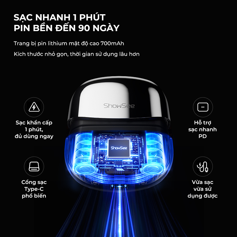 Trang bị pin dung lượng 700mAh, máy cạo râu cầm tay SHOWSEE KM10 cho thời gian hoạt động liên tục lên tới 90 phút sau mỗi lần sạc đầy. Đây là mức pin đủ để sử dụng trong nhiều ngày liền, giúp tiết kiệm thời gian sạc và đảm bảo sự tiện lợi khi mang theo. Mặc dù có thời lượng pin dài, máy vẫn hỗ trợ sạc nhanh chỉ trong khoảng 1 giờ nhờ cổng Type-C. Loại cổng sạc phổ biến này có thể dùng chung với nhiều thiết bị điện tử khác, giúp việc sạc trở nên linh hoạt hơn, đặc biệt hữu ích khi đi công tác hoặc du lịch. Sự kết hợp giữa dung lượng pin lớn và tốc độ sạc nhanh mang lại trải nghiệm tiện lợi, đáp ứng nhịp sống bận rộn hàng ngày.