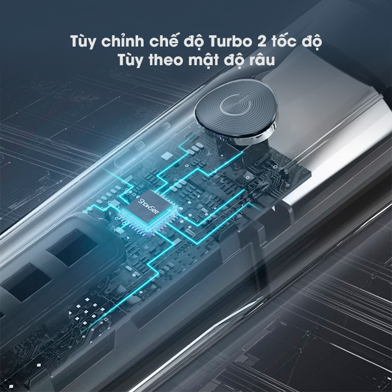 Máy cạo râu ShowSee F305-GY sử dụng động cơ mạnh mẽ với cơ chế 120 lần mỗi giây sẽ tự đông nhận biết trạng thái râu và nguồn để tự động điều chỉnh kịp thời tốc độ động cơ. Từ đó giúp máy cạo râu luôn duy trì lực cắt phù hợp, mang đến cảm giác dễ chịu và độ an toàn hơn. Cấu trúc giảm tiếng ồn và hấp thụ xung kích cùng động cơ tốc độ cao giúp máy hoạt động êm ái hơn và có tiếng ồn thấp. Đặc biệt, tùy vào mật độ râu và tình trạng da ở các vị trí khác nhau mà người dùng có thể nhấn và giữ 1 nút để chuyển sang chế độ Turbo. Lúc này máy cạo râu sẽ điều chỉnh tốc độ với 2 cường độ là thấp 2700 vòng/phút cho râu mỏng và cao 3000 vòng/phút cho râu dày.