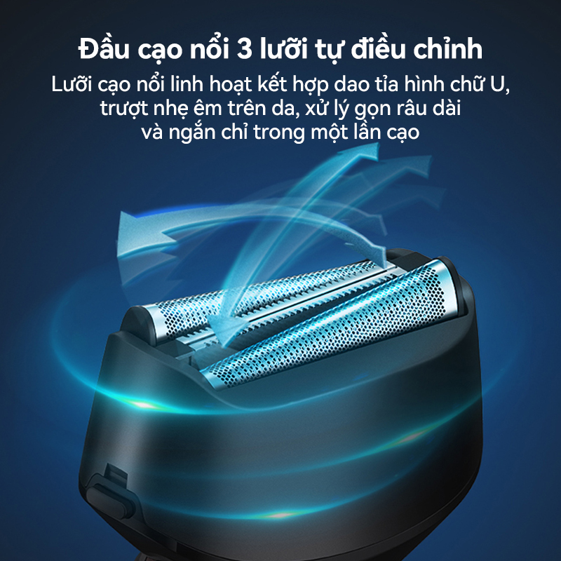 Được trang bị hệ thống 3 đầu cạo nổi với góc nghiêng khoảng 10°, máy cạo râu SHOWSEE có khả năng thích ứng linh hoạt với từng đường cong trên khuôn mặt. Thiết kế này giúp lưỡi dao ôm sát da, tiếp xúc đều trên nhiều bề mặt khác nhau, từ má, cằm đến viền quai hàm. Nhờ đó, máy có thể xử lý trơn tru cả râu ngắn lẫn râu dài mà không bỏ sót hay gây cảm giác rát da. Cấu trúc đầu cạo nổi còn giúp duy trì độ ổn định khi di chuyển, đảm bảo đường cạo mượt mà và nhanh chóng. Sự kết hợp giữa khả năng ôm sát và sự linh hoạt của ba đầu cạo mang lại hiệu quả làm sạch cao, đồng thời duy trì cảm giác thoải mái cho người dùng trong suốt quá trình cạo râu.