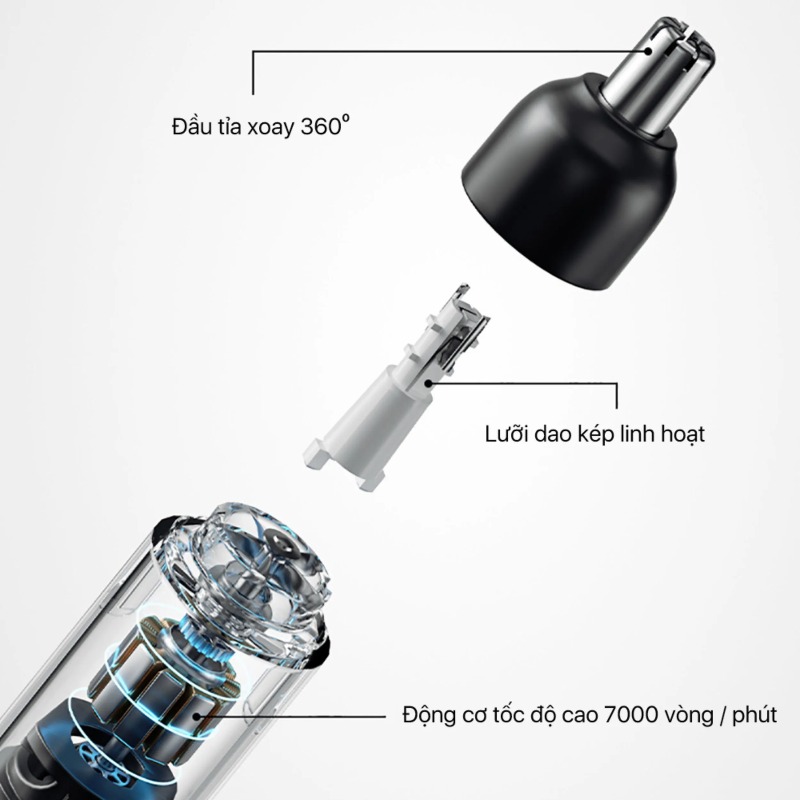 Thiết bị không chỉ hỗ trợ cắt tỉa lông mũi mà còn sử dụng hiệu quả để làm sạch vùng tai, giúp giảm thiểu nguy cơ tích tụ bụi bẩn và vi khuẩn tại những khu vực nhạy cảm. Nhờ trang bị lưỡi dao kép bằng thép không gỉ xoay 360 độ, Enchen EN005 đảm bảo cắt tỉa nhanh chóng, chính xác mà vẫn an toàn cho làn da. Đầu bo tròn cùng thiết kế đa hướng giúp thao tác linh hoạt hơn mà không gây tổn thương. Động cơ mini tốc độ cao 7000 vòng/phút hoạt động mạnh mẽ, vận hành êm ái và không tạo ra tiếng ồn khó chịu trong quá trình sử dụng.