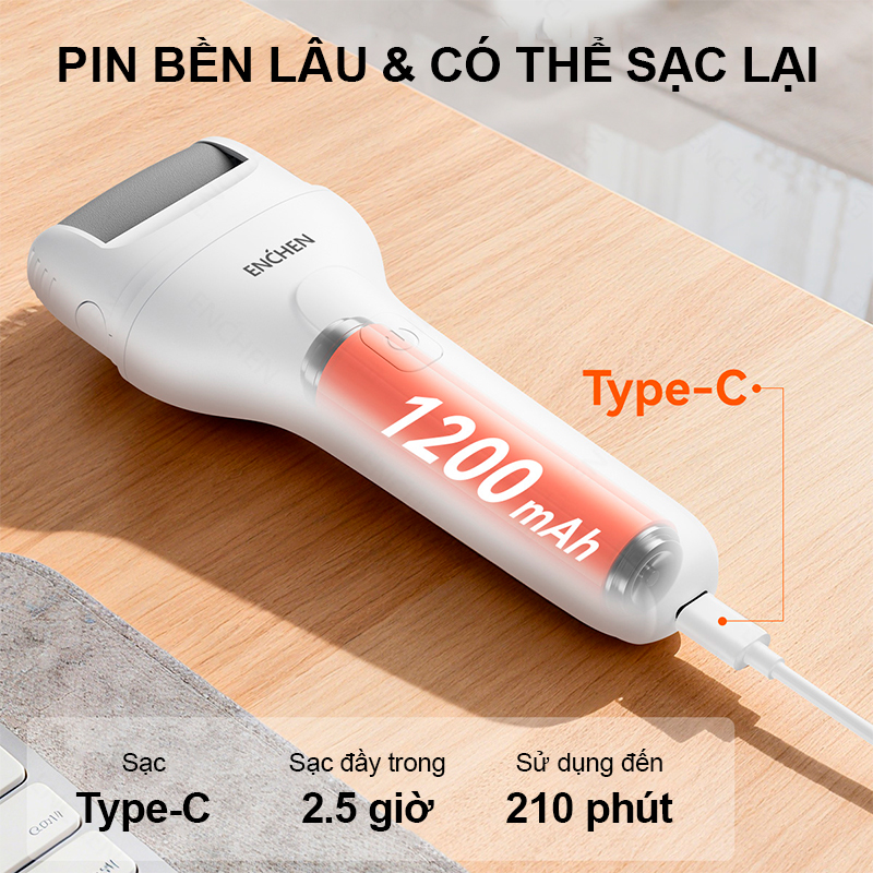Enchen Rock 2 sở hữu kiểu dáng hoàn toàn không dây, mang lại sự thoải mái khi sử dụng mà không lo vướng hay hạn chế phạm vi thao tác. Bên trong là pin dung lượng lớn cho thời gian vận hành ấn tượng, cho phép máy hoạt động liên tục khoảng 3.5 giờ sau khi sạc đầy trong 150 phút. Nhờ đó, bạn có thể thoải mái chăm sóc gót chân nhiều lần mà không cần lo lắng về việc phải sạc lại thường xuyên, đặc biệt tiện lợi khi mang theo du lịch hoặc sử dụng ở bất kỳ không gian nào.