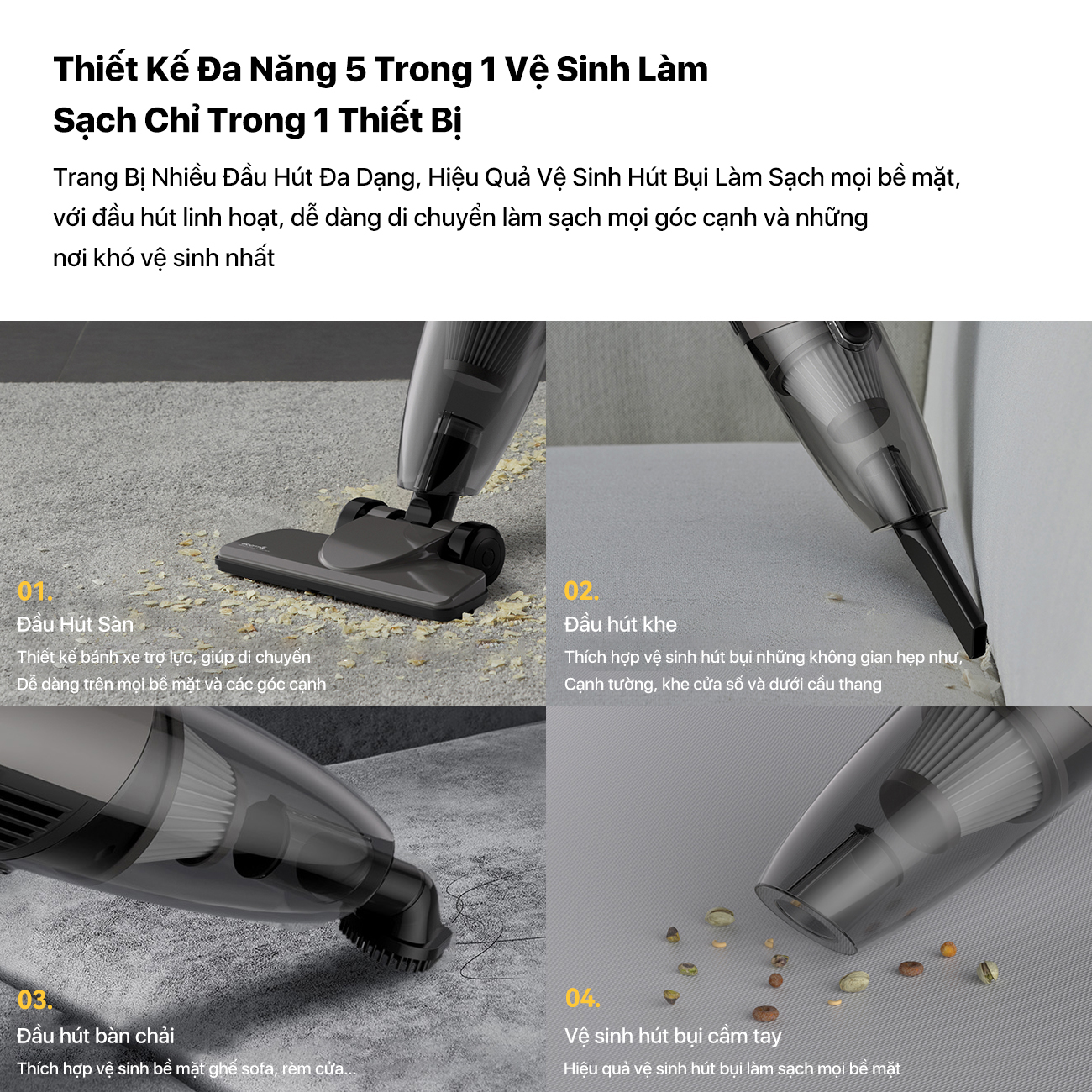 Máy hút bụi Deerma DX120C đi kèm bộ phụ kiện đa năng bao gồm đầu hút sàn, đầu hút khe và đầu bàn chải chuyên dụng, cho phép linh hoạt chuyển đổi theo từng nhu cầu làm sạch khác nhau. Nhờ sự kết hợp tiện dụng này, Deerma mang đến giải pháp vệ sinh toàn diện cho không gian sống, dễ dàng làm sạch từ những khu vực rộng như sàn nhà, sàn gạch, sàn gỗ cho đến các vị trí khó tiếp cận như khe cửa, góc tường, gầm bàn ghế hay các kẽ hở nhỏ hẹp. Đầu bàn chải hỗ trợ quét bật bụi bẩn bám chặt, trong khi đầu hút khe giúp loại bỏ bụi mịn tích tụ lâu ngày, đảm bảo mọi ngóc ngách trong căn phòng đều được làm sạch kỹ lưỡng, góp phần giữ cho ngôi nhà luôn gọn gàng, sạch sẽ và trong lành.