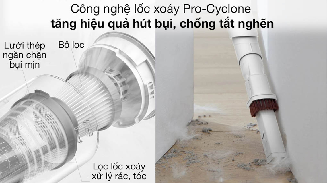 Máy hút bụi Deerma VC01 được trang bị công nghệ hút xoáy Pro-Cyclone, Rocket Vacuum tiên tiến hút mạnh mẽ, xử lý và nén bụi tốt, hạn chế tắc nghẽn ống hút . Đặc biệt, công nghệ này còn giúp gia tăng độ bền cho máy, bảo vệ bộ lọc hiệu quả.