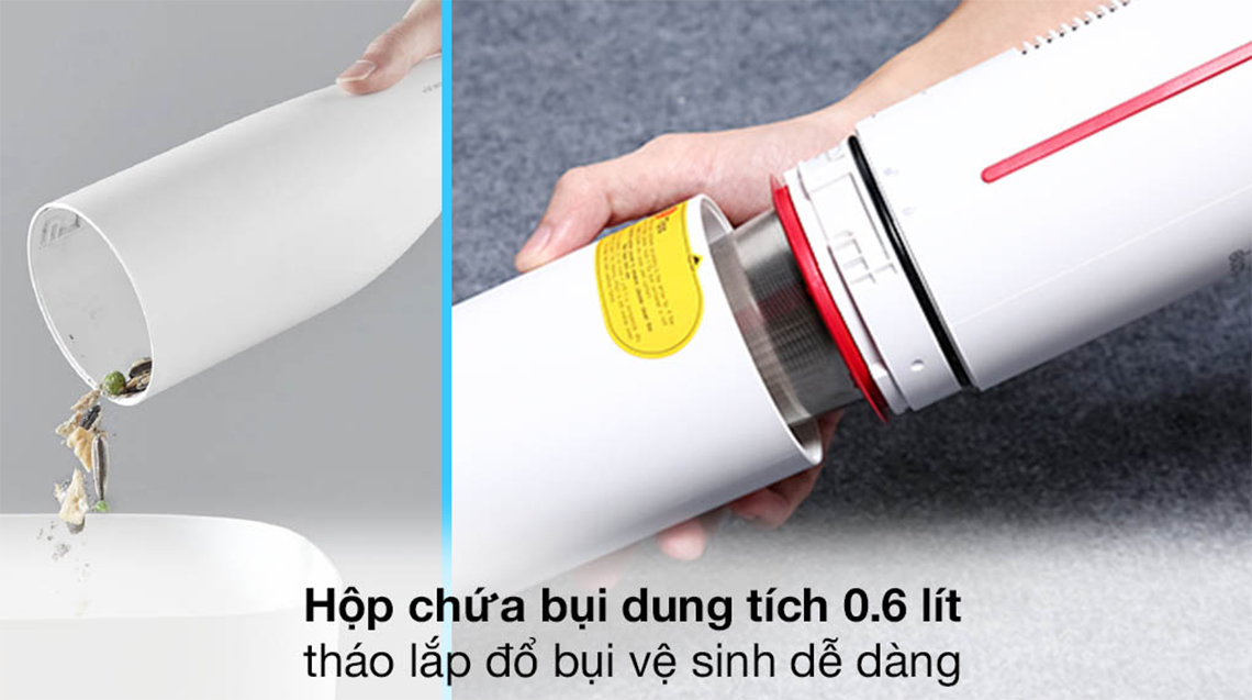 Cốc bụi được trang bị với dung tích 0.6L cho khả năng chứa đựng tốt lượng bụi lớn. Ngoài ra, người dùng còn có thể dễ dàng tháo gỡ để đổ bụi và vệ sinh bên trong để tránh việc tích tụ và phát sinh vi khuẩn. Đặc biệt đi kèm bộ máy hút bụi còn có một móc treo bằng silicon giúp bạn dễ dàng cố định, lưu trữ máy một cách gọn gàng và ngăn nắp hơn.