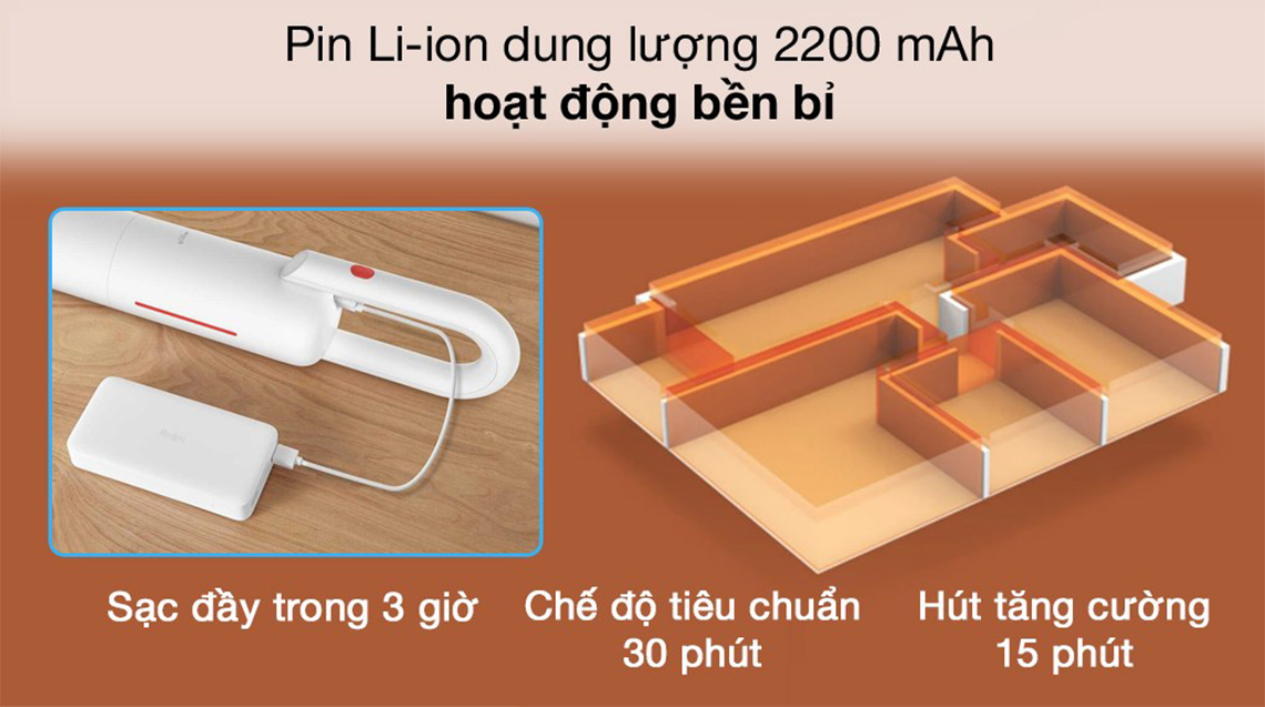Sau khi sạc đầy trong 3 giờ dùng liên tục trong 30 phút (mức hút tiêu chuẩn), 15 phút (mức hút tăng cường). Chính vì vậy với 1 lần sạc đầy cho máy hút bụi Deerma người dùng có thể sử dụng liên tục làm sạch toàn bộ không gian từ phòng ngủ đến phòng khách mà không làm gián đoạn công việc.