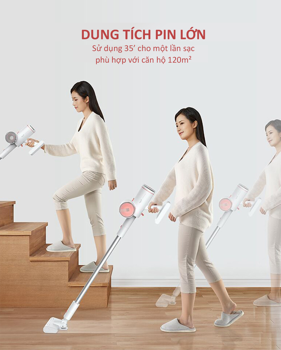 Máy hút bụi Deerma VC25 được trang bị viên pin BMS, có dung lượng lớn lên đến 2200mAh. Bên cạnh đó, phiên bản VC25 còn tích hợp thêm hệ thống quản lý pin thông minh giúp giám sát hoạt động của máy trong thời gian thực, duy trì tốc độ hao pin ở mức thấp nhất. Ngoài ra, chỉ với 1 lần sạc thì máy có thể cung cấp thời lượng pin hoạt động trong 35 phút, đủ để người dùng dọn dẹp, vệ sinh một căn hộ rộng tầm 120m².