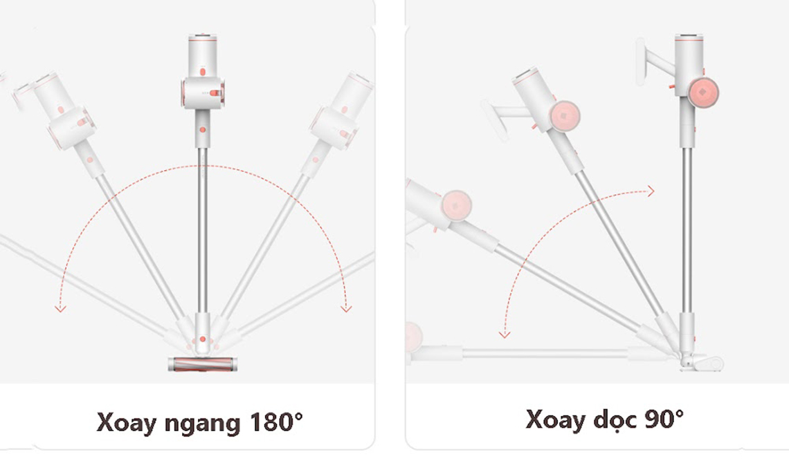 Tay cầm giữa động cơ và pin được thiết kế một góc 60° giúp giảm áp lực lên tay người dùng khi phải sử dụng máy lâu. Bên cạnh đó, đầu hút bụi sàn có thể xoay 90° theo chiều dọc và 180° theo chiều ngang, do đó máy hút bụi sẽ dễ dàng len lỏi vào khắp các ngóc ngách của căn phòng để làm sạch nhanh chóng hơn.