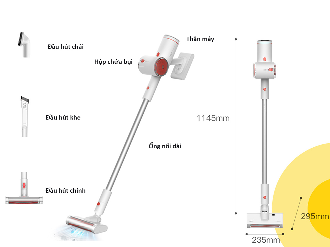 3 đầu hút là bàn chải sàn, đầu hút chổi quét và đầu hút vòi được trang bị để bạn có thể thoải mái thay đổi đầu chổi theo các tình huống làm sạch khác nhau từ mặt sàn đến ngóc ngách, khe kẽ,...đều được làm sạch hiệu quả.