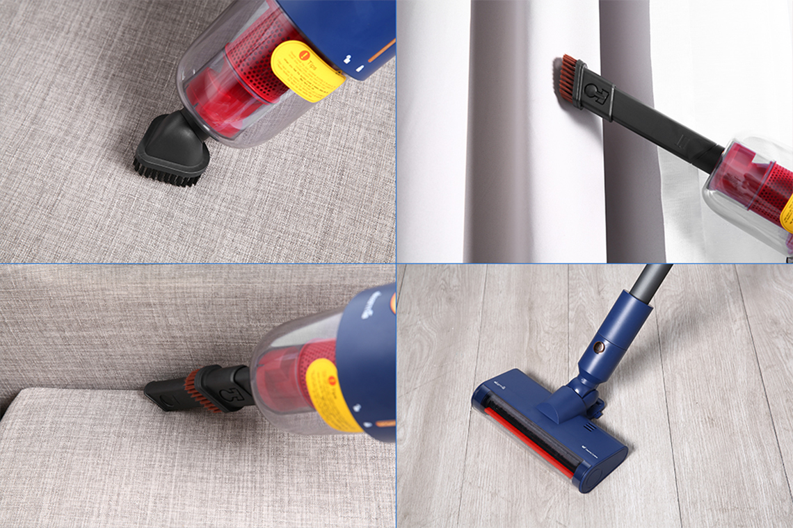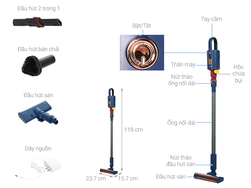 - 3 loại đầu hút: đầu hút sàn và đầu hút 2 trong 1, đầu hút bàn chải hút sạch bụi bẩn ở mọi khu vực.