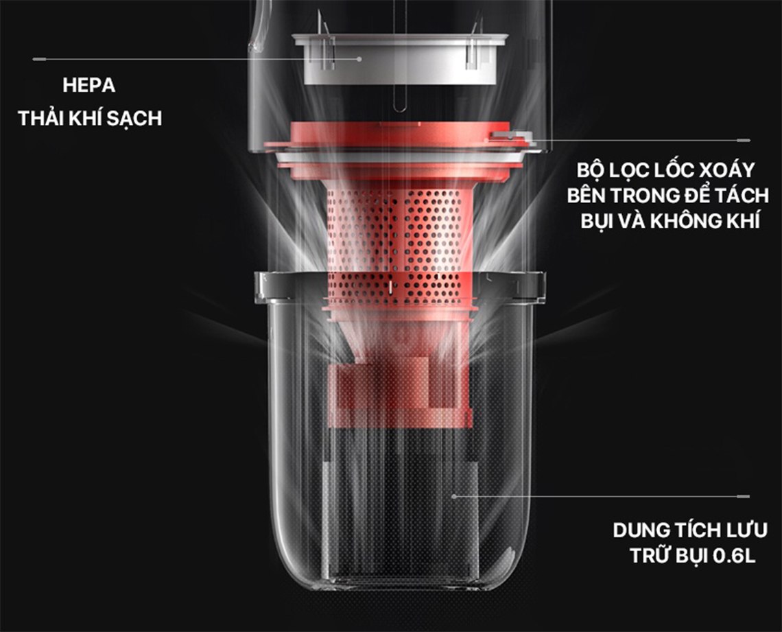 Máy hút bụi Deerma VC811 sở hữu công nghệ hút lốc xoáy Pro-Cyclone, Rocket Vacuum chống tắc nghẽn tốt, hút được các mảnh vụn lớn, bụi, tóc,... mà không tắt nghẽn động cơ, giúp tăng hiệu quả hút bụi và tiết kiệm điện năng hiệu quả.