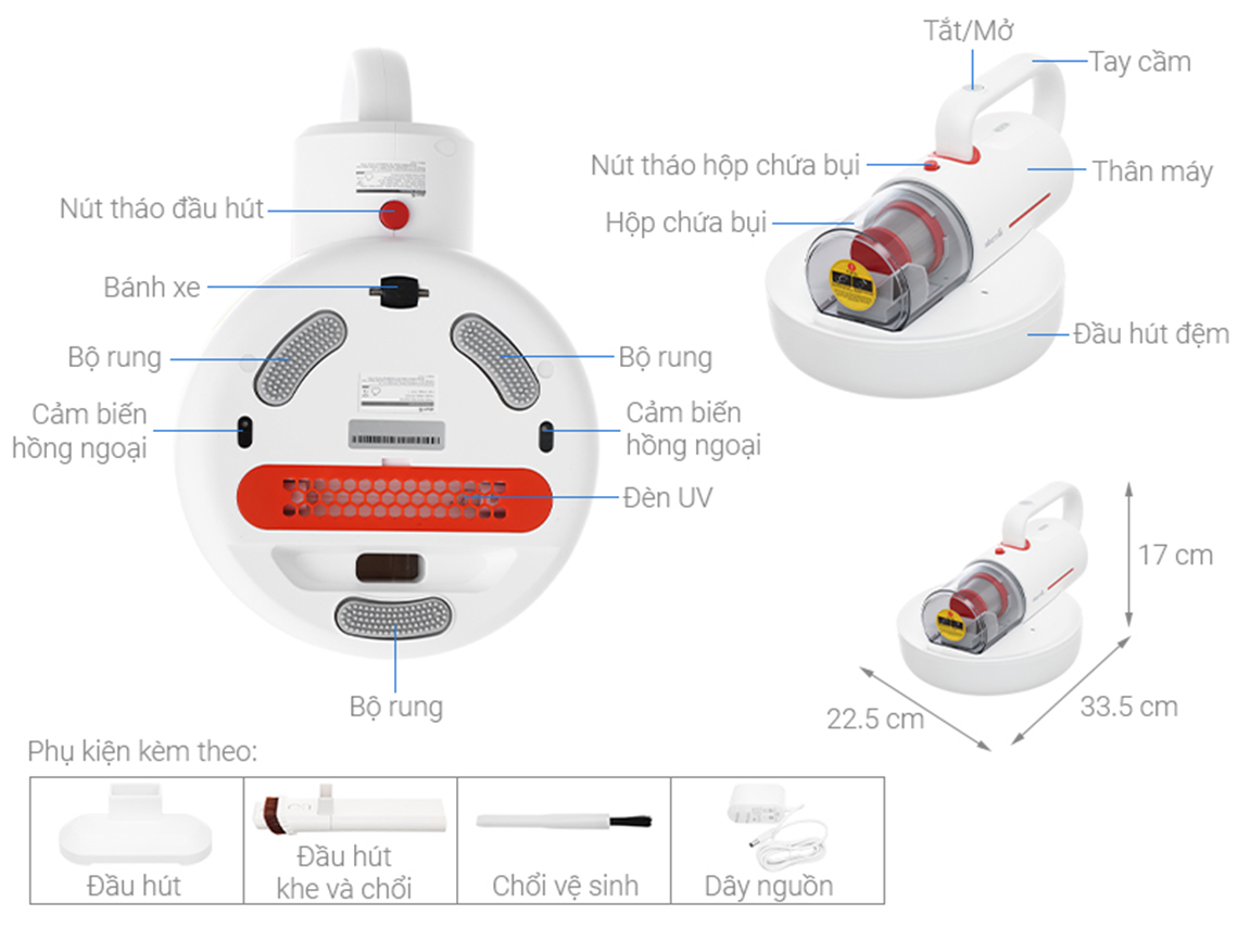 Máy hút bụi cầm tay không dây Deerma CM1900 sở hữu thiết kế 3 đầu hút thay thế tiêu chuẩn: hút đệm, hút góc và hút bụi lớn, đáp ứng mọi nhu cầu dọn dẹp khác nhau của người dùng. Bên cạnh đó, nhà sản xuất còn trang bị hệ thống lọc HEPA cùng tính năng khử trùng bằng tia UV giúp tiêu diệt và loại bỏ 99.9% các loại vi khuẩn, mạt bụi nhà, ve bọ, các chất gây di ứng có trong chăn, ga, gường, nệm,…