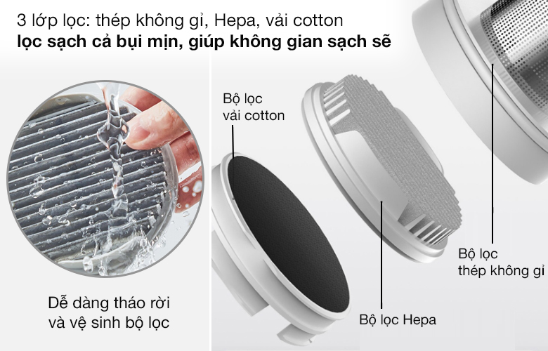 Deerma DX1000 sở hữu cơ chế lọc chuyên sâu với sự kết hợp từ 3 lớp: Thép không gỉ, HEPA và vải Cotton. Hệ thống này thiết lập một hàng rào ngăn chặn kiên cố, giúp giữ lại hoàn toàn các tác nhân gây dị ứng và hạt siêu nhỏ ngay bên trong khoang chứa. Công nghệ lọc đa tầng không chỉ ngăn ngừa tình trạng bụi bẩn phát tán ngược ra môi trường mà còn đảm bảo luồng khí thải ra luôn tinh khiết, góp phần bảo vệ tối đa hệ hô hấp cho cả gia đình.