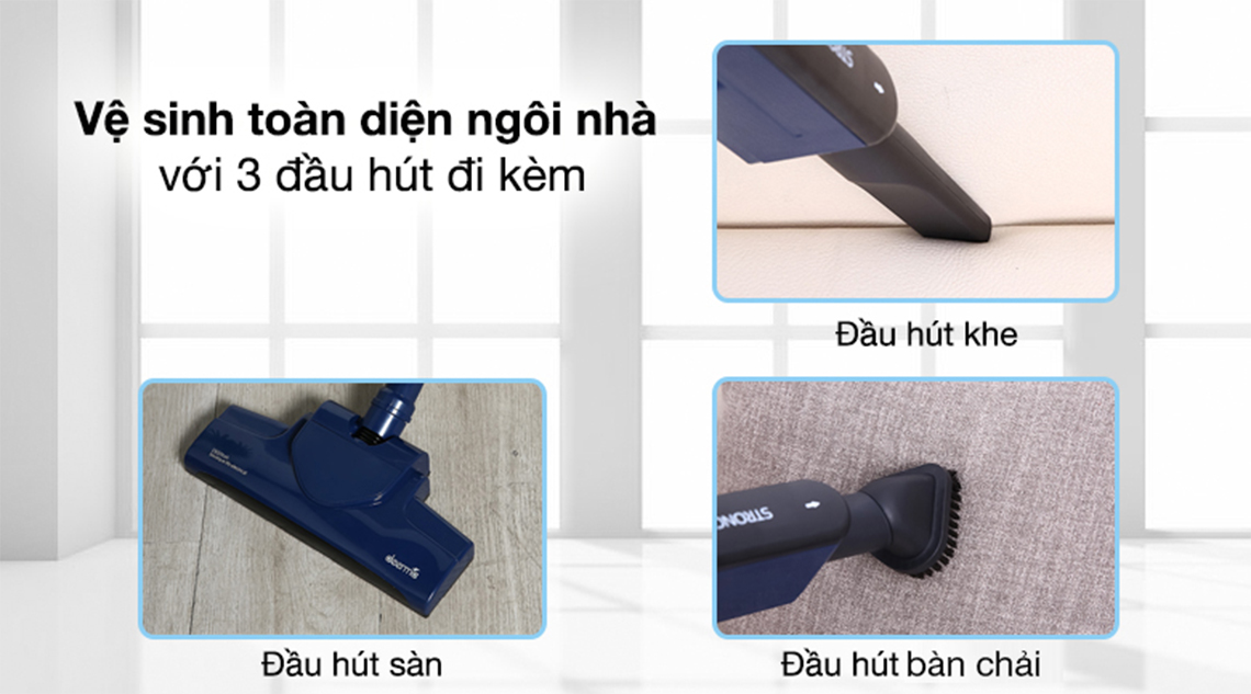 Trong đó có đầu hút sàn chuyên dùng để làm sạch sàn nhà, thảm, đầu hút khe loại bỏ bụi dễ dàng ở các đường rãnh, khe hẹp và đầu hút bàn chải phù hợp làm sạch ghế sofa, rèm,…
