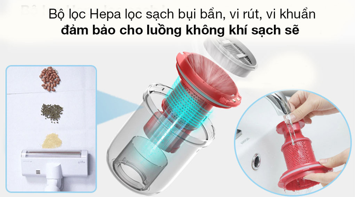 Máy hút bụi kết hợp bộ lọc không khí đạt tiêu chuẩn HEPA không những làm sạch không gian mà còn mang lại bầu không khí trong lành, kể cả những hạt bụi li ti trong không khí.