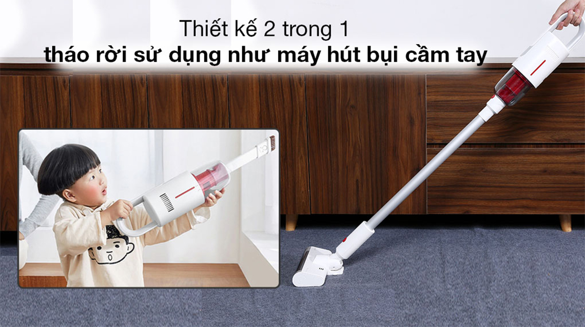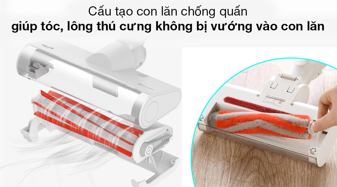 Bên cạnh đó, máy hút bụi có thể chuyển đổi sang chế độ cầm tay, thích hợp làm sạch bụi, vụn bánh trên ghế ô tô, sofa.. Với cấu tạo con lăn chống quấn, giúp tóc và lông thú cưng không bị vướng vào con lăn, không phải vệ sinh lại con lăn sau khi hút bụi, tiện lợi hơn.