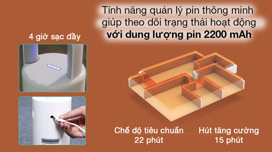 Máy hút bụi không dây Deerma được trang bị tính năng quản lí pin thông minh, giúp theo dõi trạng thái hoạt động theo thời gian thực của pin, giảm mức độ hao hụt và kéo dài tuổi thọ của pin. Với khoảng 4 giờ sạc, máy hút bụi cho thời gian dùng ở chế độ tiêu chuẩn là 22 phút và chế độ hút mạnh là 15 phút.
