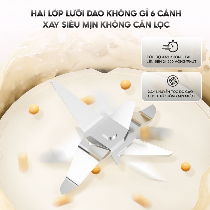 Máy AQUA sở hữu lưỡi dao xay cắt đa hướng được chế tạo từ chất liệu không gỉ, thiết kế hai tầng sáu cánh giúp xử lý nguyên liệu đồng đều ở mọi vị trí trong cối xay. Công suất 800W kết hợp cùng tốc độ quay không tải đạt 24.500 vòng mỗi phút tạo lực xay mạnh, hỗ trợ nghiền nhuyễn hiệu quả các loại hạt và thực phẩm. Nhờ cấu tạo lưỡi dao đặc biệt cùng sức mạnh vận hành cao, máy giúp thành phẩm đạt độ mịn đồng nhất, không để lại cặn, tiết kiệm thời gian chế biến mà không cần phải lọc lại. Đặc điểm này phù hợp cho nhu cầu sử dụng đa dạng trong gia đình hiện đại.