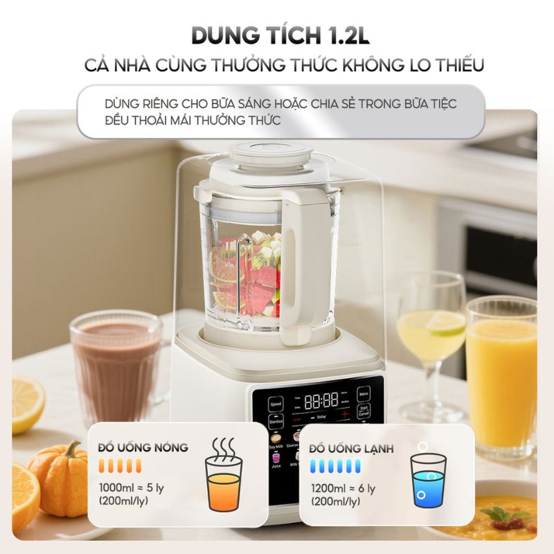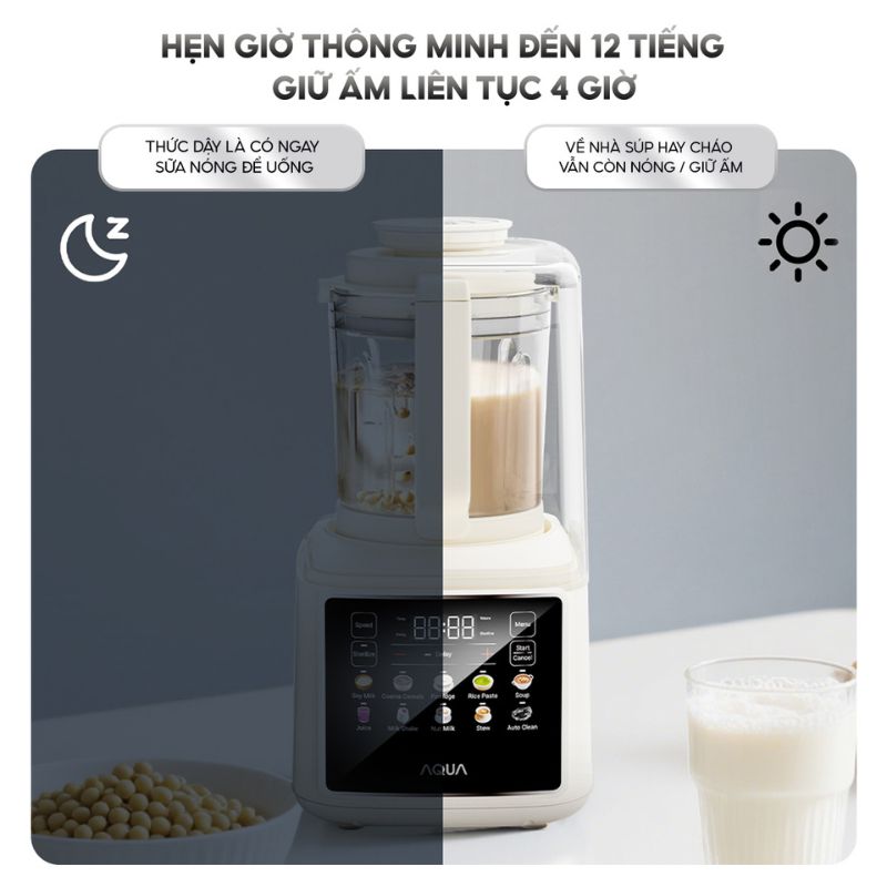 Đáp ứng đa dạng nhu cầu dinh dưỡng nhờ được trang bị tới 10 chế độ xay chuyên biệt cho nhiều loại thực phẩm và thức uống khác nhau. AQUA AQS-BMT1201T(W) còn tích hợp tính năng hẹn giờ lên đến 12 tiếng, cho phép chuẩn bị nguyên liệu trước và cài đặt thời gian xay linh hoạt, hỗ trợ tối ưu cho những người bận rộn. Bên cạnh đó, chức năng giữ ấm trong 4 tiếng giúp duy trì độ nóng và hương vị thơm ngon của thức uống sau khi chế biến, tạo sự thuận tiện tối đa cho quá trình sử dụng hàng ngày mà không lo thức uống nguội lạnh hoặc giảm chất lượng.