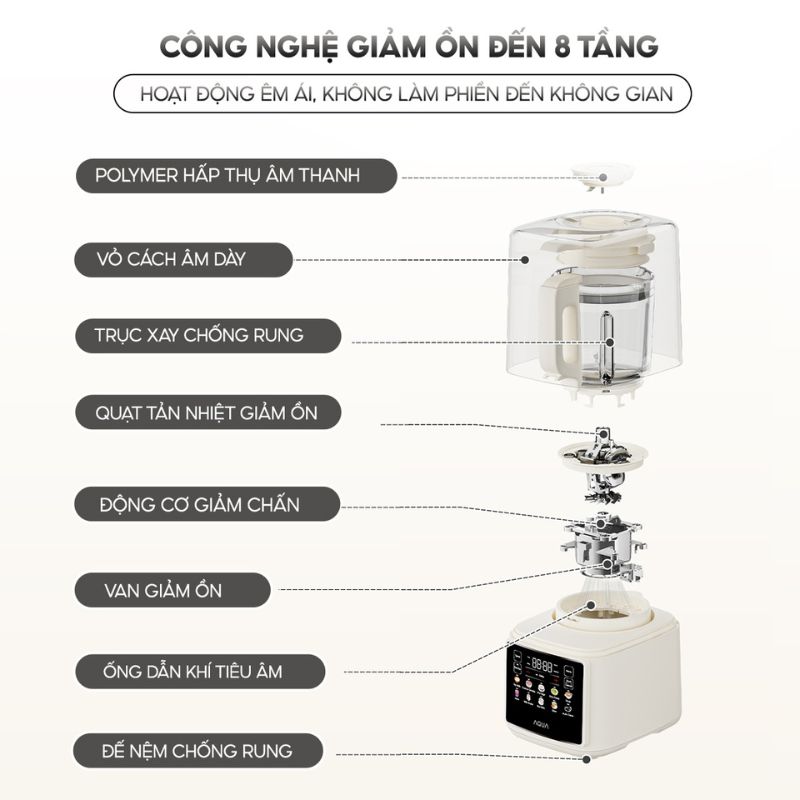 Máy làm sữa hạt đa năng AQUA AQS-BMT1201T(W) vận hành êm ái nhờ ứng dụng công nghệ giảm ồn lên tới 8 tầng. Hệ thống này gồm polymer hấp thụ âm thanh, vỏ cách âm dày, trục xoay chống rung, quạt tản nhiệt giảm ồn, động cơ giảm chấn, van giảm ồn, ống dẫn khí tiêu âm và nệm chống rung, phối hợp chặt chẽ nhằm hạn chế tối đa tiếng ồn trong suốt quá trình sử dụng. Việc tích hợp đồng bộ nhiều lớp giảm ồn giúp giảm thiểu âm thanh, không gây ảnh hưởng đến các không gian sinh hoạt xung quanh. Đặc điểm này phù hợp cho việc đặt thiết bị tại bếp, phòng khách hoặc các môi trường cần yên tĩnh, đem lại trải nghiệm vận hành tiện nghi, không làm gián đoạn các hoạt động thường ngày.