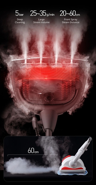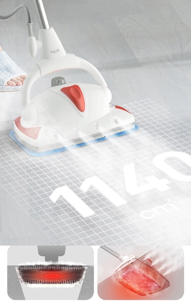 Bên cạnh đó, kết cấu tỏa hơi nước nóng kép đồng thời ở cả tấm lau nóng phía dưới và 4 lỗ phun hơi ở phía trước, tác động mạnh mẽ, tăng hiệu quả làm sạch. Hơi nước nóng phun xa đến 20-60cm tạo một khoảng không gian phụ hình chữ nhật, cho khả năng diệt khuẩn ở không gian đến 1140cm²