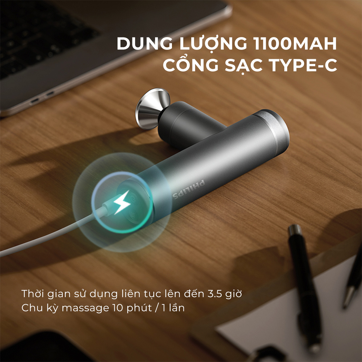 Sử dụng viên pin dung lượng lớn 1100mAh, máy massage Philips cho phép vận hành liên tục lên đến 3,5 giờ chỉ với một lần sạc đầy. Sản phẩm hỗ trợ cổng sạc Type C hiện đại, giúp quá trình nạp pin nhanh chóng, tiện lợi và dễ dàng kết nối với nhiều thiết bị khác nhau. Ngoài ra, máy thiết lập chu kỳ massage tự động 10 phút mỗi lần, góp phần bảo vệ vùng cơ không bị tác động quá lâu tại một vị trí cố định. Thiết kế này đảm bảo an toàn, nâng cao hiệu quả thư giãn và đáp ứng tốt nhu cầu sử dụng thường xuyên trong nhiều điều kiện sinh hoạt.