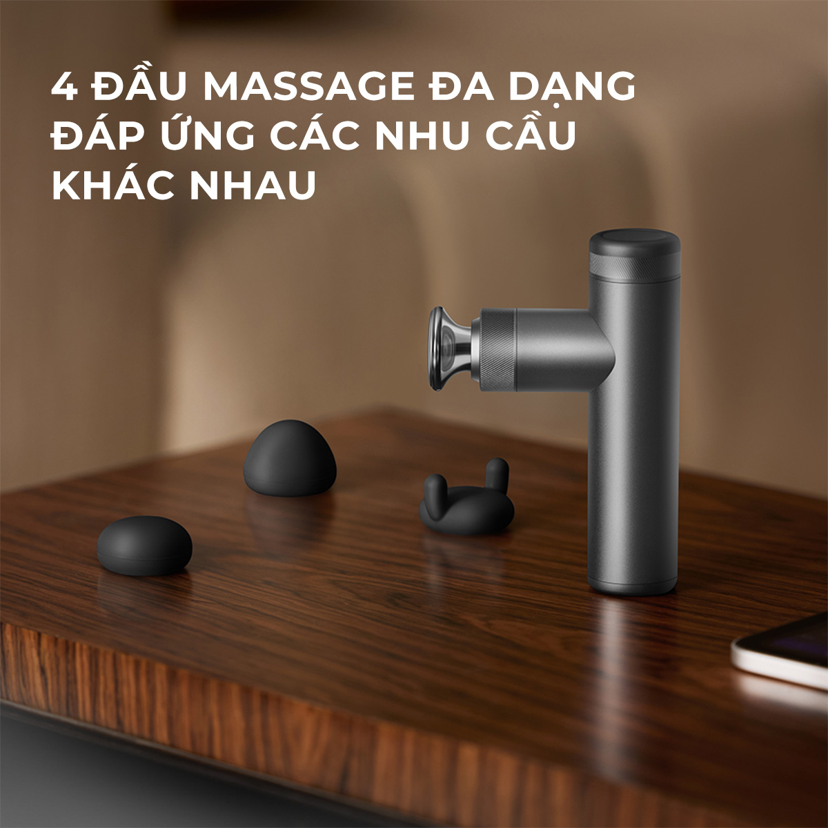 Đi kèm bốn đầu massage chuyên dụng, máy massage Philips đáp ứng đa dạng nhu cầu tác động lên các nhóm cơ khác nhau trên cơ thể. Bộ phụ kiện bao gồm một đầu massage hợp kim có khả năng làm nóng, phù hợp sử dụng cho các nhóm cơ lớn hoặc vùng lưng cần chườm nóng sâu. Ba đầu massage bằng silicone mềm mại hỗ trợ thao tác trên các vùng cơ như cánh tay, đùi hoặc các khu vực nhạy cảm hơn, đảm bảo an toàn và mang lại cảm giác êm ái khi sử dụng. Sự đa dạng của các đầu massage giúp cá nhân hóa trải nghiệm, tối ưu hiệu quả thư giãn và phục hồi cho nhiều vị trí khác nhau trên cơ thể.