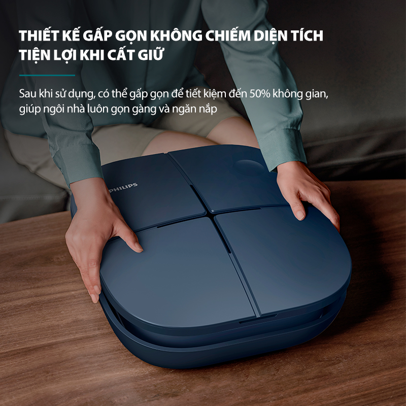 Máy massage chân Philips PPM6504 sở hữu thiết kế gấp gọn thông minh, cho phép thu nhỏ kích thước tới 51%, từ 32.25cm xuống chỉ còn 15.7cm, giúp tiết kiệm không gian lưu trữ tối đa. Khi dựng đứng, thiết bị chỉ chiếm khoảng 0.15m², phù hợp cho mọi không gian sống, đặc biệt là những căn hộ nhỏ hoặc khu vực có diện tích hạn chế, mang lại tính linh hoạt và tiện dụng vượt trội trong quá trình sử dụng hàng ngày.