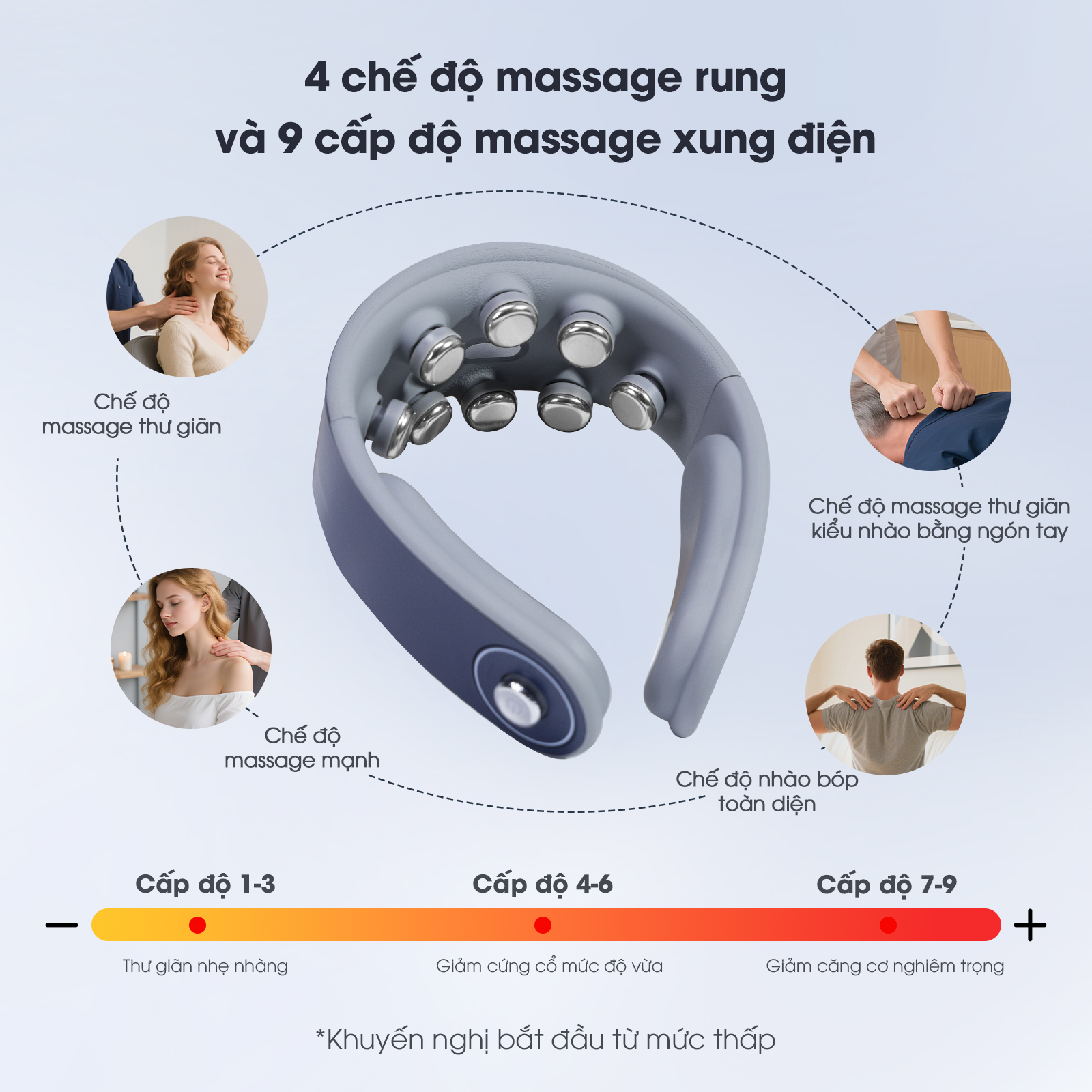 Máy massage cổ Bomidi kết hợp giữa massage rung và xung điện EMS hiện đại, mang đến trải nghiệm thư giãn đa dạng và chuyên sâu. Với 4 chế độ cùng 4 cấp độ rung, kết hợp thêm 4 chế độ và 9 cấp độ xung điện, bạn dễ dàng tùy chỉnh theo nhu cầu và tình trạng cơ thể. Sự linh hoạt này giúp tác động hiệu quả lên các vùng cơ cổ, giảm căng cứng, hỗ trợ lưu thông máu và mang lại cảm giác thoải mái như được chăm sóc tại spa.