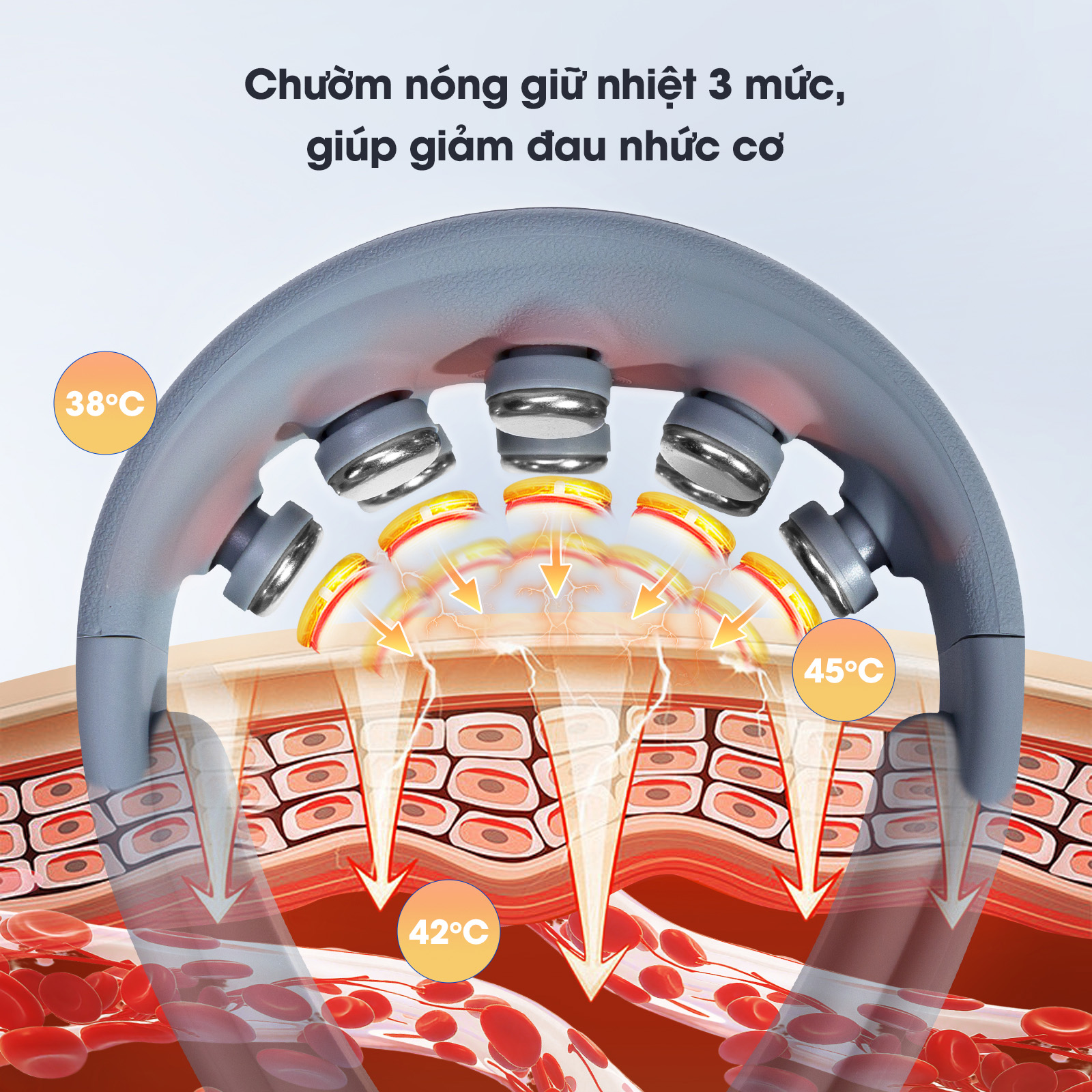 Bomidi MP3 tích hợp 3 mức nhiệt chườm ấm thông minh gồm 38°C, 42°C và 45°C, đáp ứng đa dạng nhu cầu thư giãn của người dùng. Nhiệt độ ấm vừa phải giúp làm dịu những cơn đau nhức, xua tan cảm giác mỏi cơ, đồng thời làm mềm các vùng cơ bắp căng cứng. Khi nhiệt tác động sâu vào mô cơ, quá trình lưu thông máu cũng được kích thích hiệu quả hơn. Nhờ đó, sau mỗi lần sử dụng, bạn không chỉ cảm thấy cơ thể nhẹ nhàng hơn mà còn lấy lại được tinh thần sảng khoái, tràn đầy năng lượng.